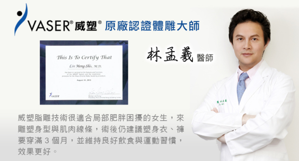 由於自己本身也在醫療美容產業工作,也知道目前已取得威塑認證的醫師並不多,台中菲仕美診所林孟羲院長,是取得台灣VASER威塑脂雕認證醫師,成為VASER威塑專業抽脂認證醫師。 台中菲仕美診所專業醫療團隊並成為中台灣地區專業認證的體雕中心。