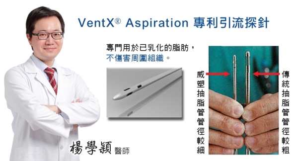 台中菲仕美體雕中心另一位體雕達人楊學穎醫師解釋,VASER威塑專利引流探針以36,000赫茲頻率乳化脂肪組織。乳化的脂肪液狀,可輕鬆經由專利威塑引流管輕易吸出。保留的結締組織,可促進皮膚收縮,達到術後雕塑與增加皮膚緊緻平滑!