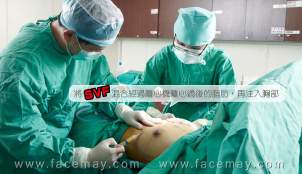 SVF生長因子:SVF是從脂肪組織中取出的生長因子,被醫學證明可以用來延長脂肪存活的機率,由此可見此細胞之珍貴程度!護理人員會將由我身上抽出的脂肪一一分裝於各個小針筒,接著將針筒放入離心機中進行離心作業,將不需要的雜質去除!200c.c的脂肪只能萃取出一點點SVF呢!有了生長因子讓注入我身體內的脂肪存活機率更高,讓我的胸部不縮水!