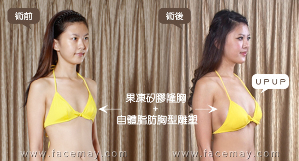 由這些術前術後照可以看的出,術前邦妮的胸部雖然不至於如平坦飛機場~但是那兩座小小山丘總是讓我感到美中不足!經過果凍矽膠隆乳+自體脂肪胸形雕塑後胸部也up up啦!