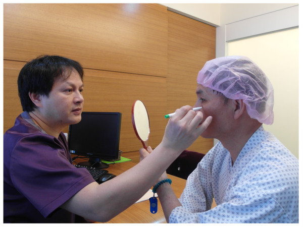 手術當天,林孟羲醫師仔細的幫林大哥畫上記號,並且告訴他手術的過程及注意事項。林大哥說他不怎麼緊張,除了是信任醫師的技術外,更期待手術完恢復後自己的樣子,因為眼袋常常讓他在台上的照片看起來不上相又會顯老,想到眼袋即將摘除反而覺得很期待!
