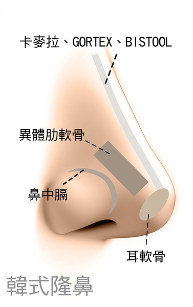 手術之前需要先畫記號,畫完記號後就開始進行隆鼻手術,韓式隆鼻手術時間大約3-3.5小時,所謂的韓式隆鼻就是指韓國醫師隆鼻的方式,一般指三段式隆鼻,事實上韓國整形醫師隆鼻的方法和材質也有很多種。三段式隆鼻術/DAST鼻雕術是指鼻背(山根)(Dorsum)、鼻翼(Alar)、鼻柱(Strut)、鼻尖(Tip)做量身訂作的雕塑,優點是:效果自然、低排斥、可量身打造鼻型,特別適合鼻頭大、鼻頭鼻梁塌陷者、朝天鼻者、鷹勾鼻者。