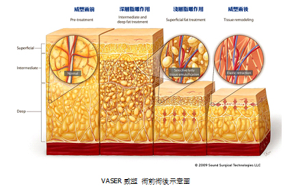 VASER威塑脂雕是一種利用超音波進行的溶脂的新型技術,藉由超音波震碎脂肪,對於組織破壞較少,可維持肌膚緊緻,較不易出現皮膚不平整的現象,且術後恢復期短。
