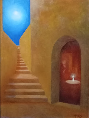 The overall composition resembles a labyrinth built of metaphors. Perspective and space are not just visual techniques—they are ontological structures: each stair, each door, each patch of light and shadow tells how life moves step by step from the ordinary present toward transcendence. It brings to mind Giorgio de Chirico’s metaphysical paintings, where architecture and space detach from reality and become stages of thought and anticipation. That arched doorway, for instance, is a threshold—both entrance and exit, boundary and passage. It forces us to consider: where is the true "inside"? And have we already crossed into it?
