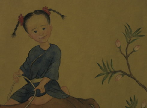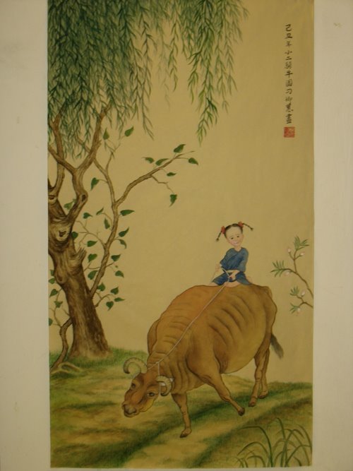 我想我的畫在千兒八百年後,大概也可以斑駁成古意盎然,但可能不會有趙孟頫這樣的書畫大家給題那八字真言。主要原因是牛背上坐了個小二。這個小女生是憑空而來的,畫成後就愛上她了。想到西晉文豪左思為他兩個女兒寫的那首《嬌女詩》,他的二女兒叫紈素, 遂喚牛背上的小人兒「小二」了。