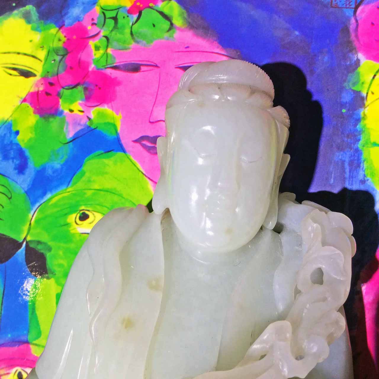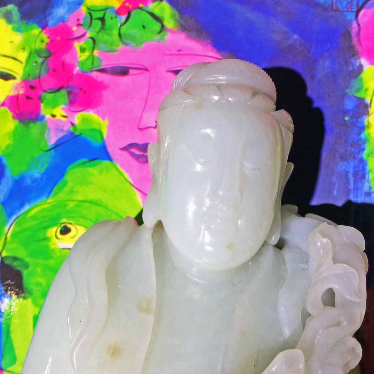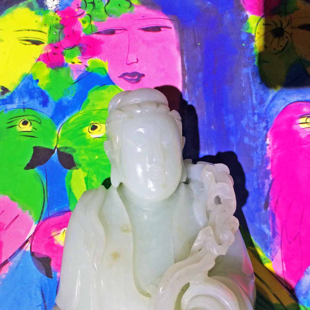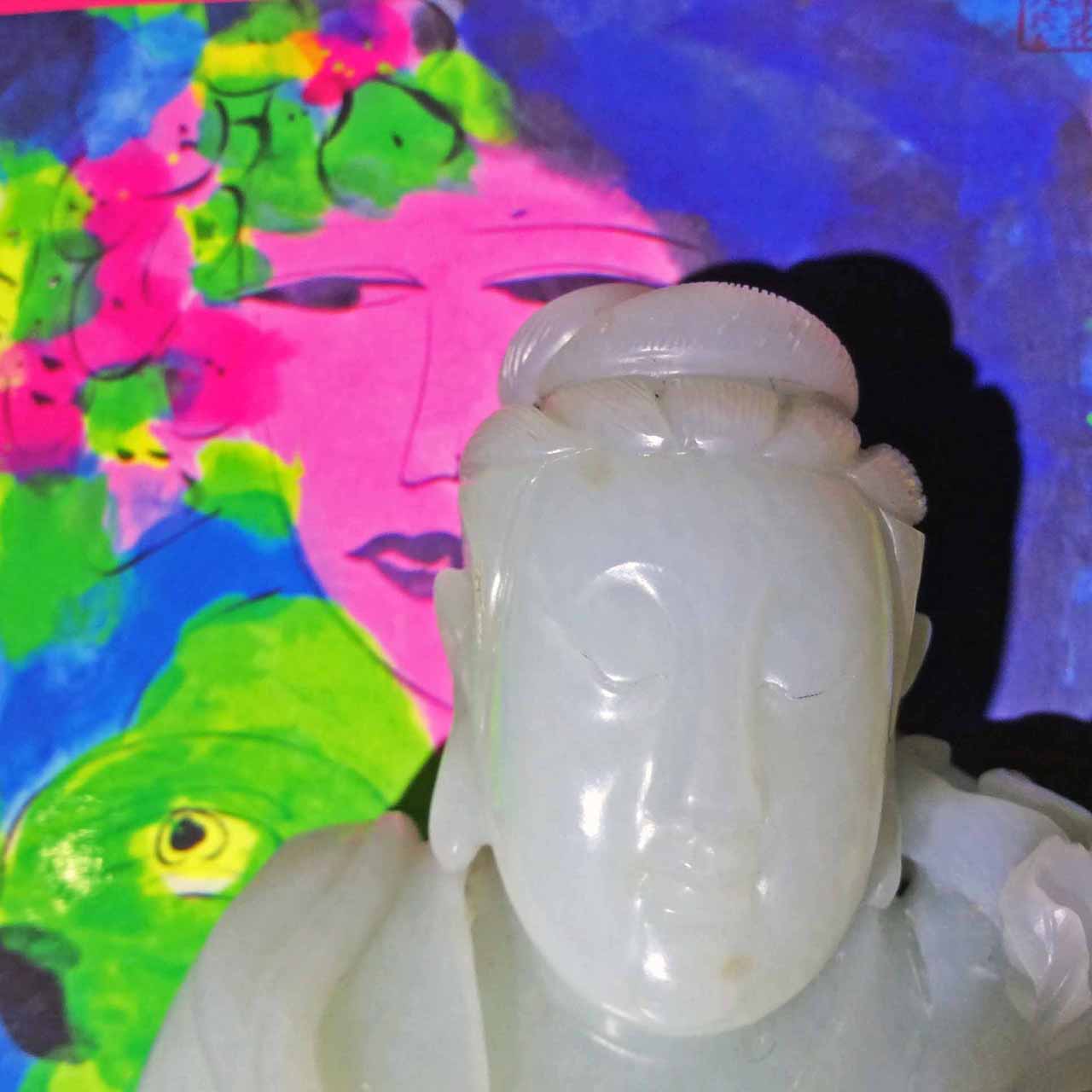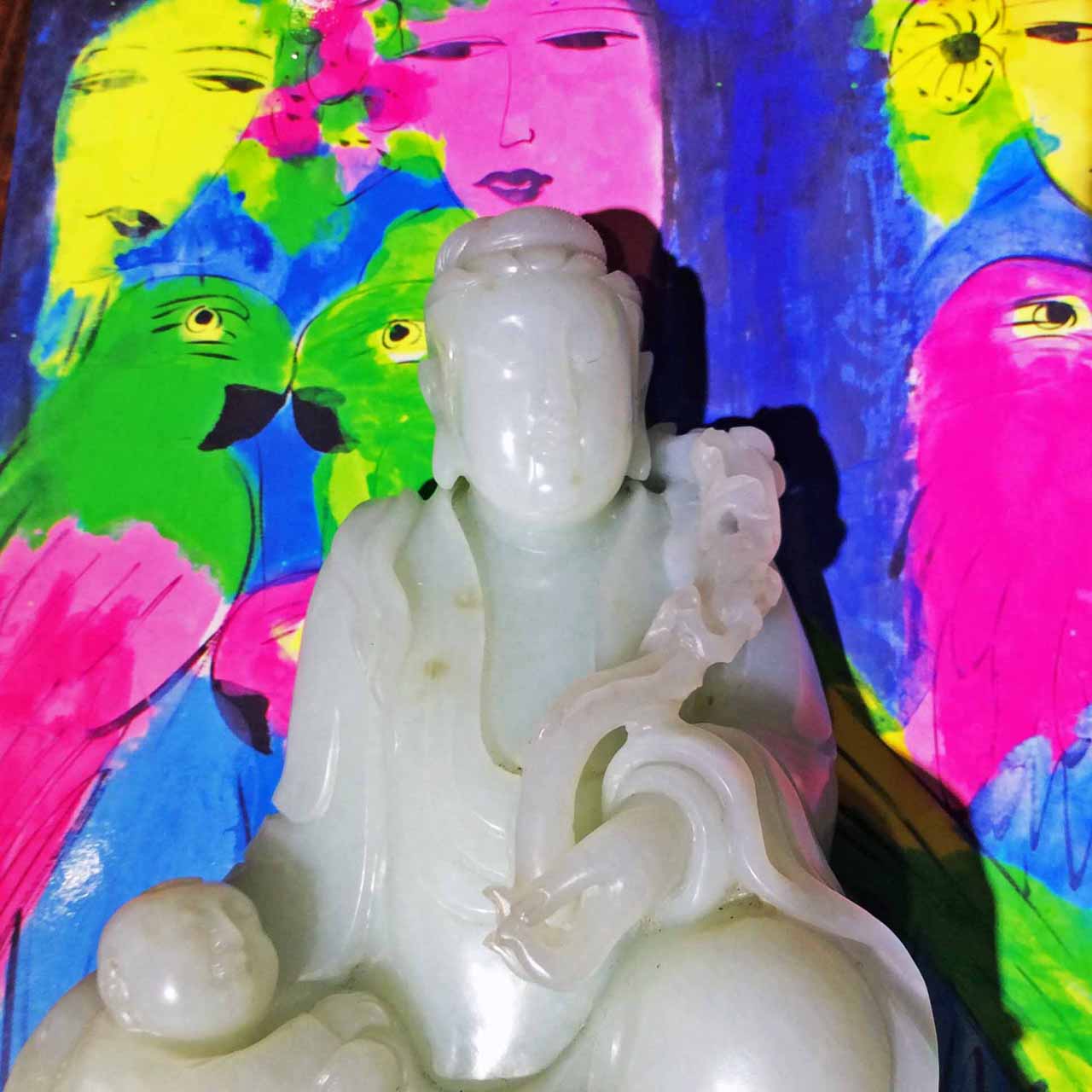 2014年8月18日中午,在台北大巨蛋附近的清樂玉器與老闆一同欣賞一位邱姓收藏家的收藏。白潤的和闐玉料雕的觀音,按法相,至少應該是民國(含)以前的,很是莊嚴,陪襯在採花大盜丁雄泉畫家的美女畫之上,更是有無相無我的感悟!