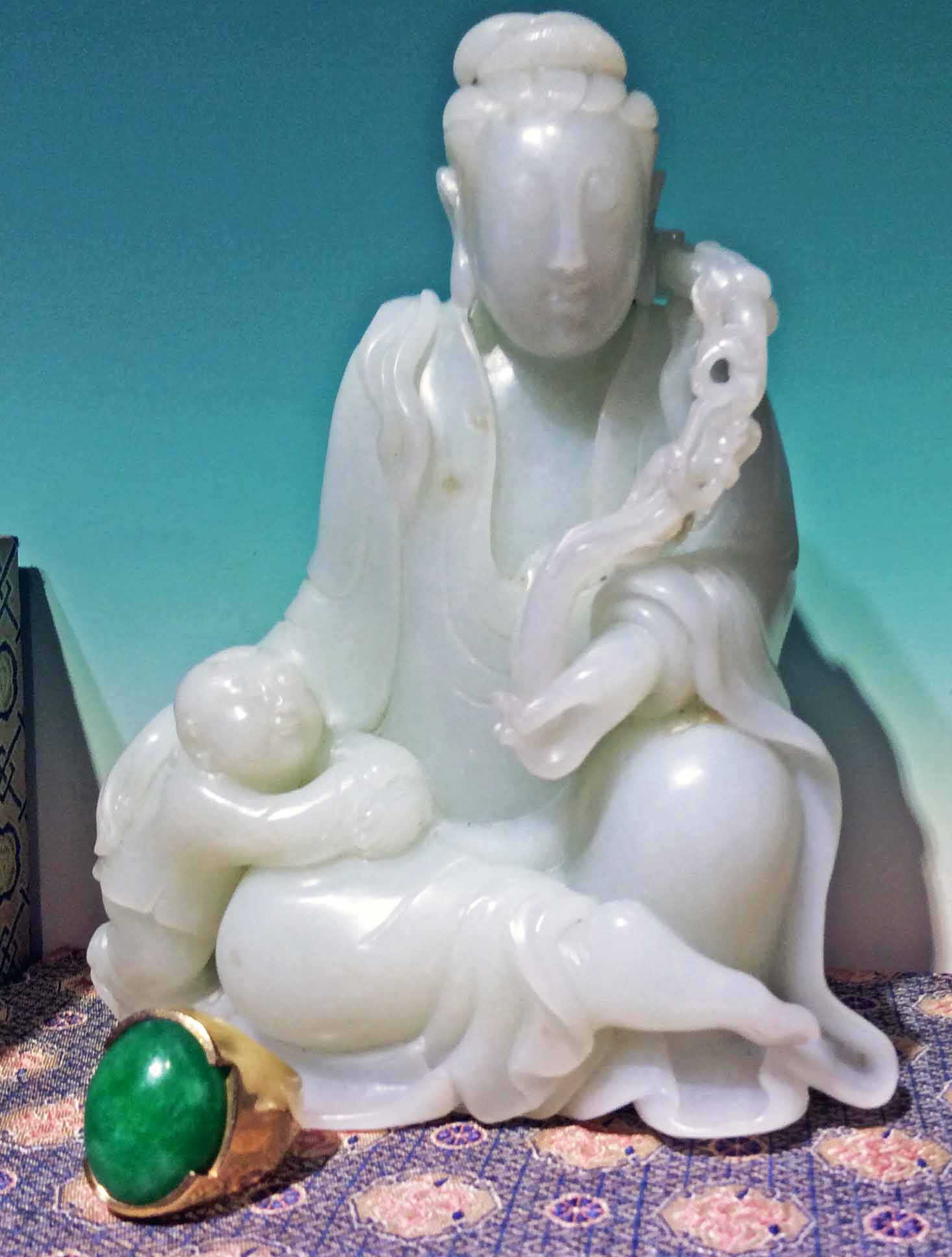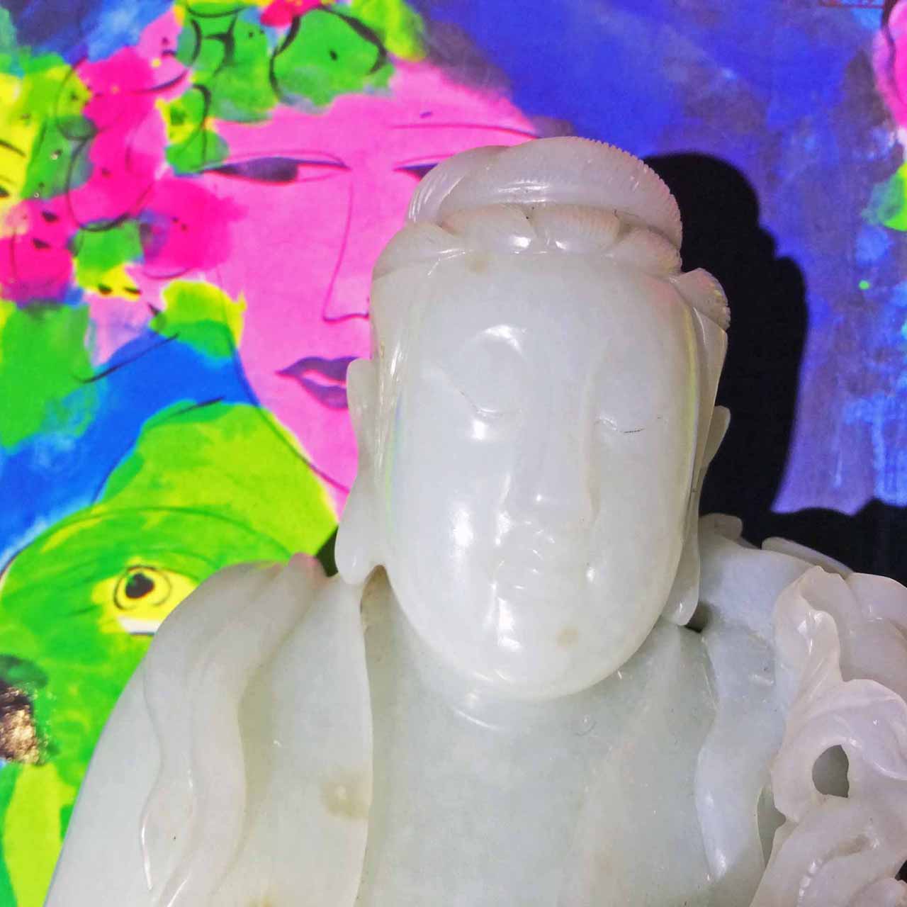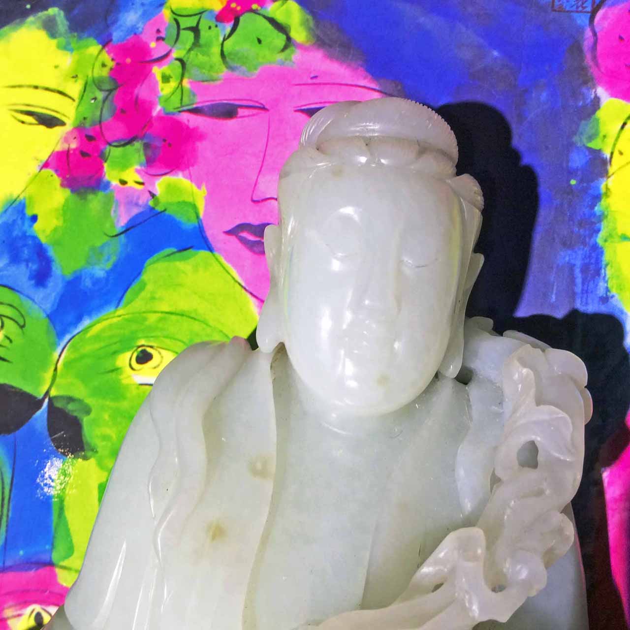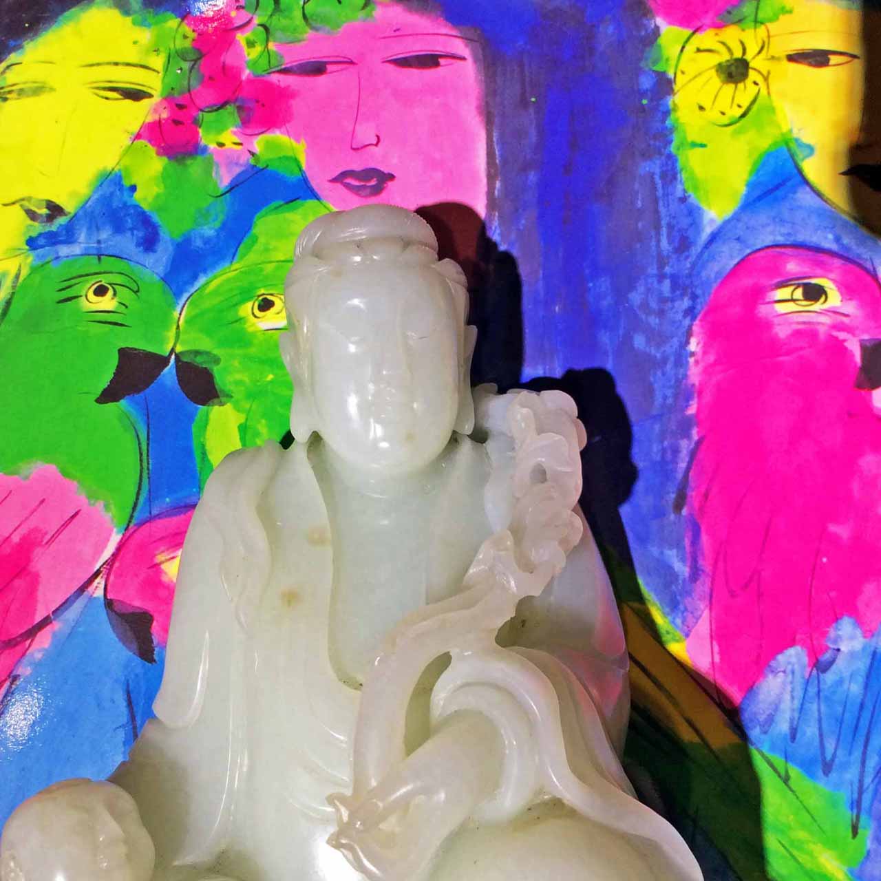 2014年8月18日中午,在台北大巨蛋附近的清樂玉器與老闆一同欣賞一位邱姓收藏家的收藏。白潤的和闐玉料雕的觀音,按法相,至少應該是民國(含)以前的,很是莊嚴,陪襯在採花大盜丁雄泉畫家的美女畫之上,更是有無相無我的感悟!