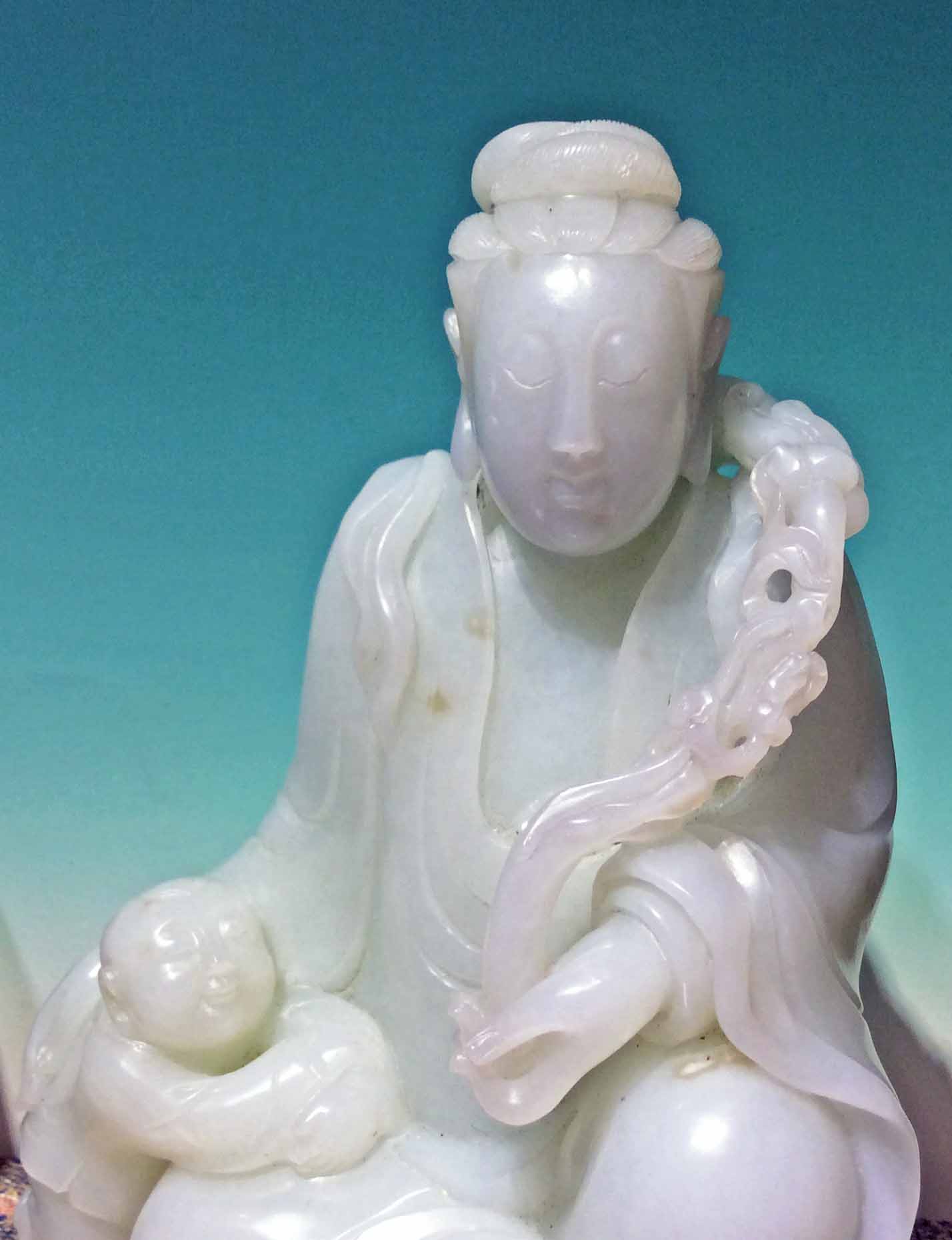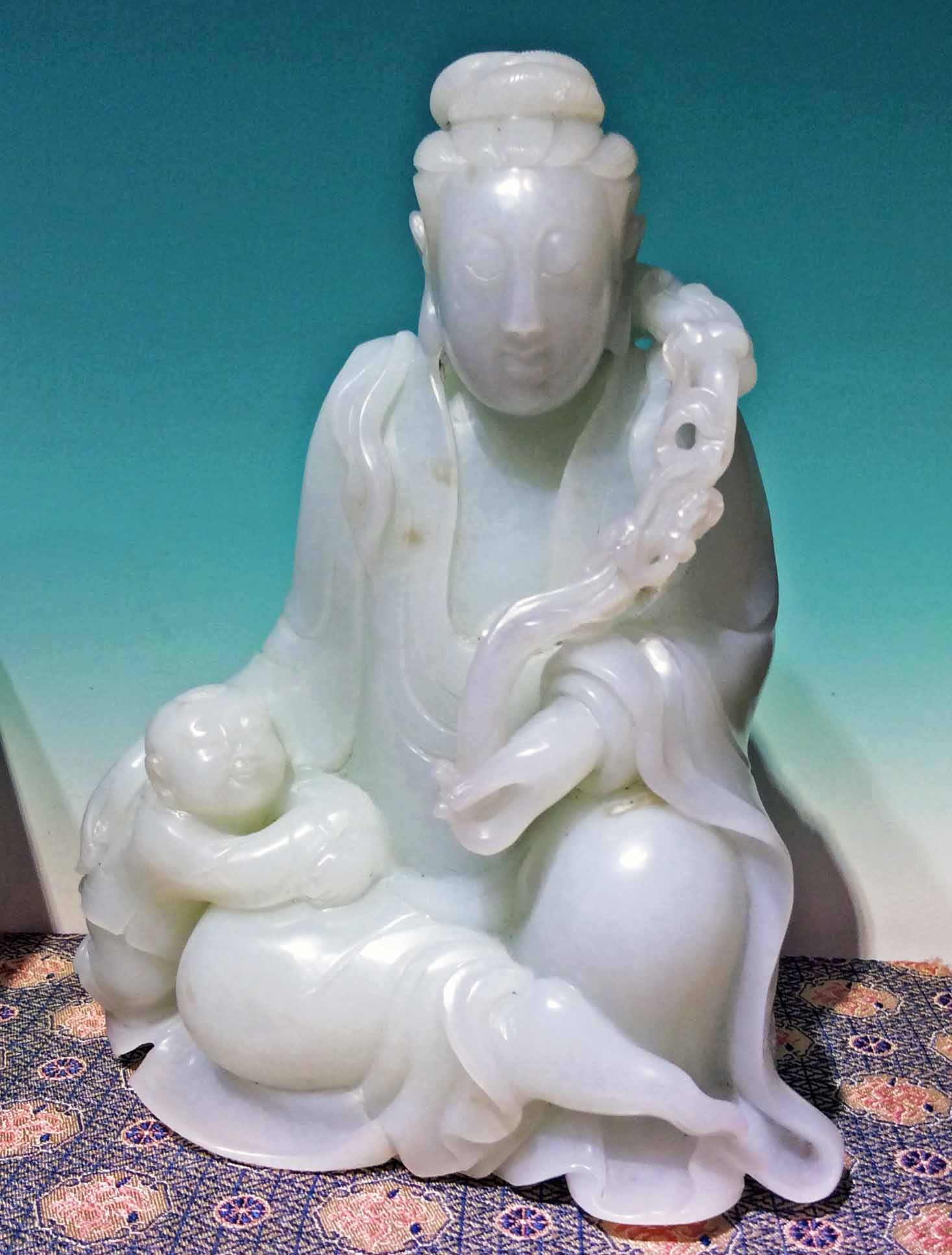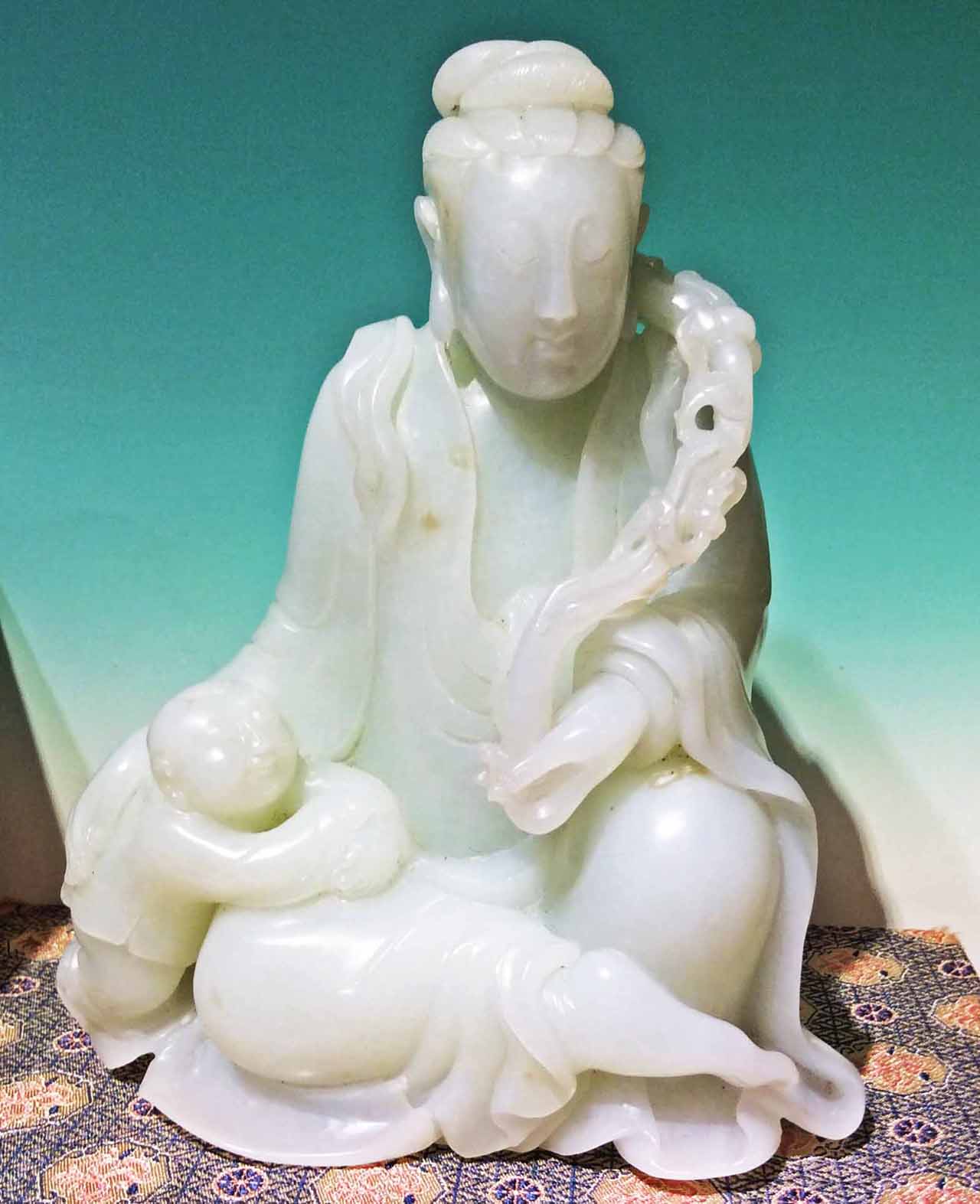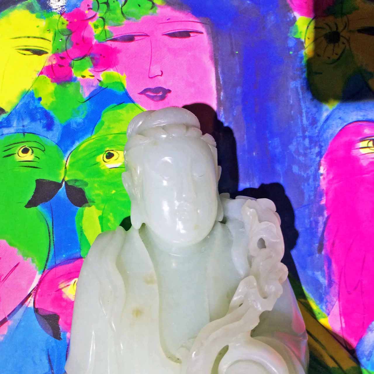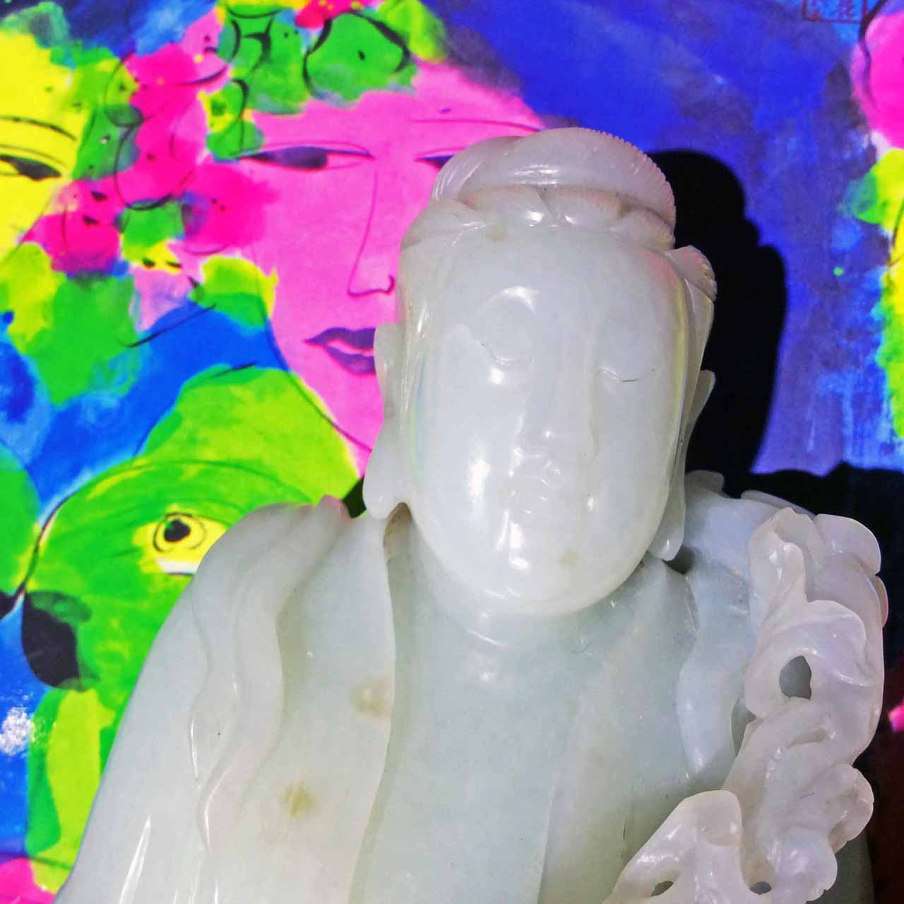 2014年8月18日中午,在台北大巨蛋附近的清樂玉器與老闆一同欣賞一位邱姓收藏家的收藏。白潤的和闐玉料雕的觀音,按法相,至少應該是民國(含)以前的,很是莊嚴,陪襯在採花大盜丁雄泉畫家的美女畫之上,更是有無相無我的感悟!