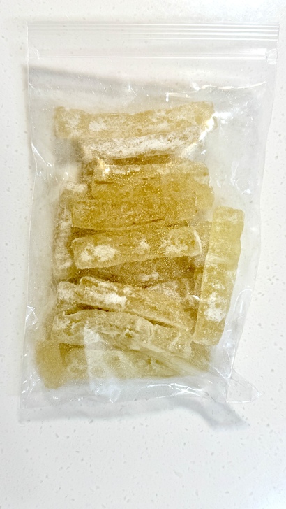 從照片看,這袋冬瓜糖有幾個特徵: • 半透明金黃色 • 表面薄糖粉 • 糖霜不厚 • 結構較自然