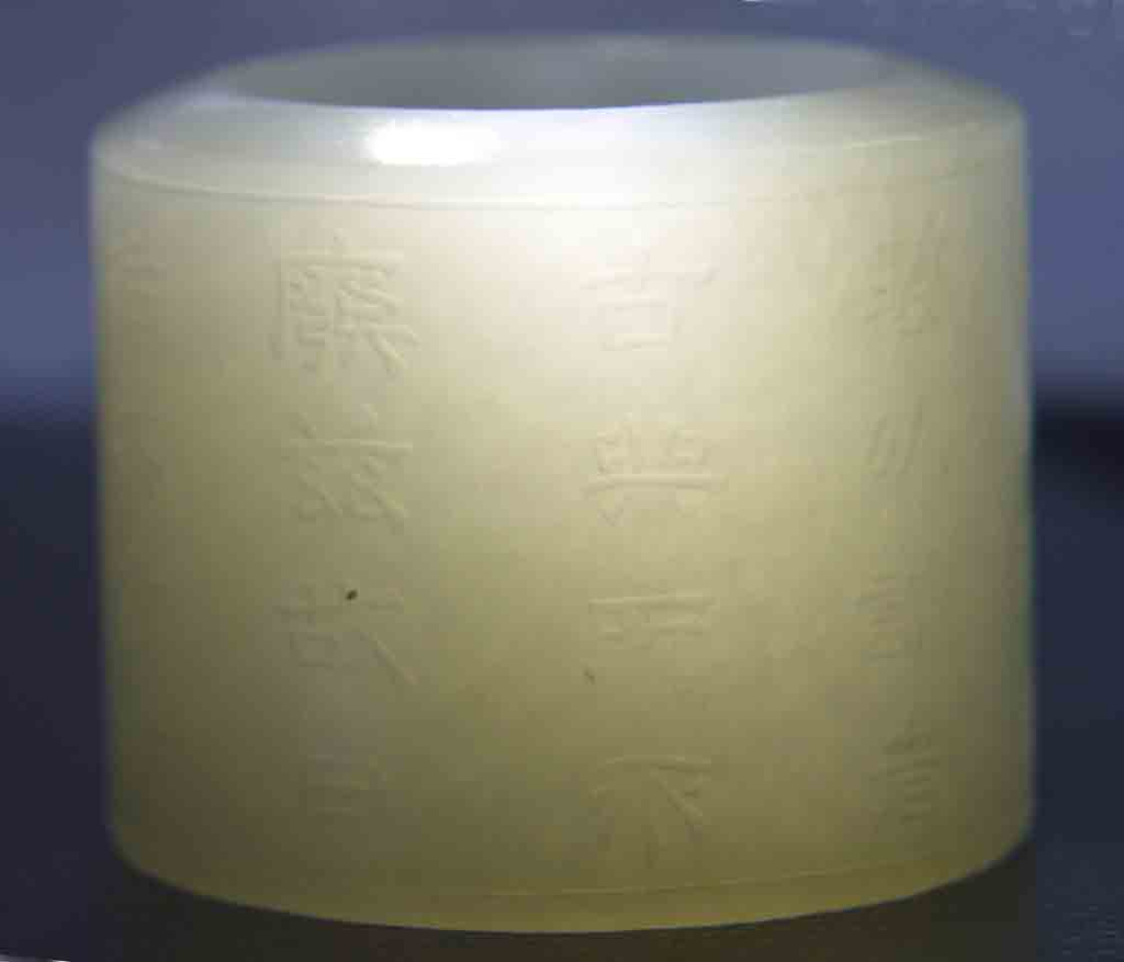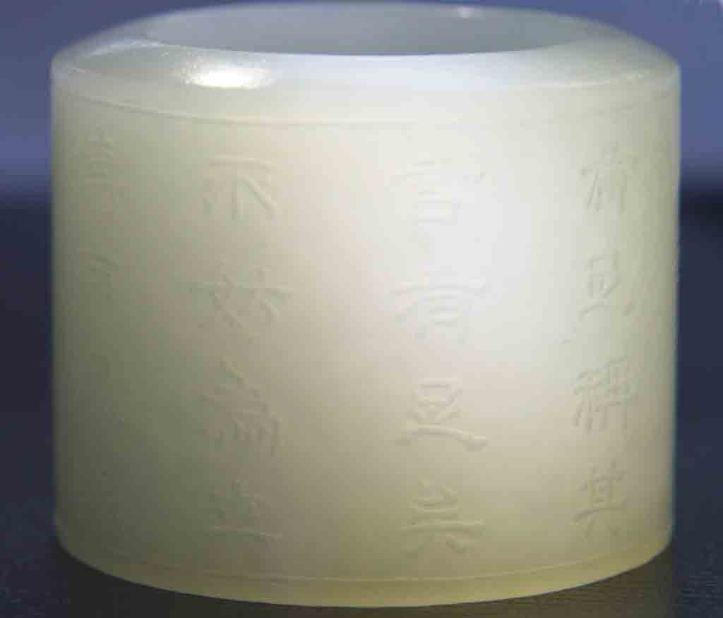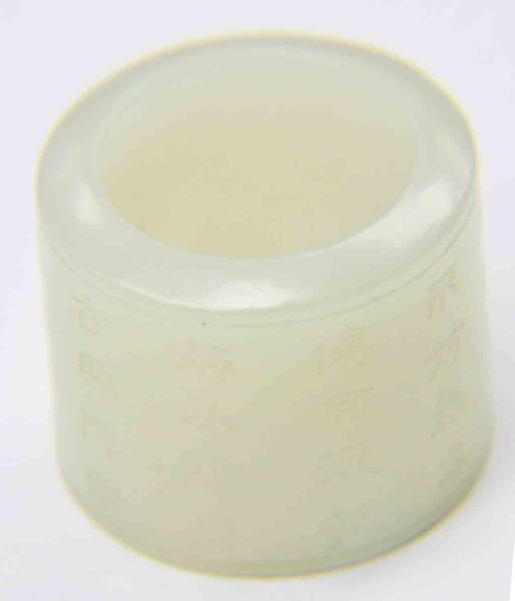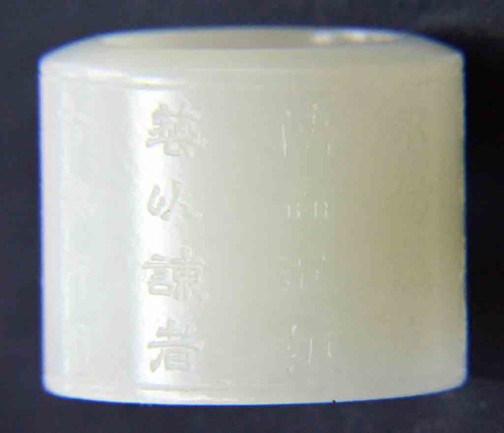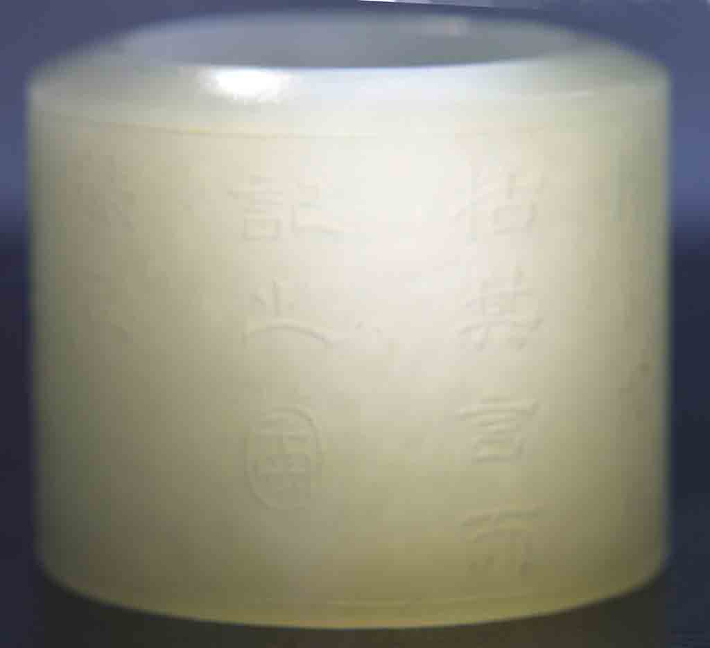 民國時期「子岡」款和闐白玉扳指 圖文:陳宗嶽 3公分直徑*後0.5公分*高2.3公分 鐫刻文字為: 能己 有足稱,其言有足矣,不妨為其立傳,而況執藝以諫者,古典所不廢,茲故曰括其言而記之。 語出:乾隆十有八年「御製玉盃記」。 玉盃記。玉盃有鼂其采。紺其色。而璘璘其文者。驟視之若土華剝蝕。炎劉以上物也。撫之留手。餰食非内出。以眎玉工姚宗仁。曰。嘻。小人之祖所為也。世其業。故識之。然則今之偽為漢玉者多矣。胡不與此同。曰安能同哉。昔者小人之父。授淳煉之法。曰。鍾氏染羽。尚以三月。而況玉哉。染玉之法。取器之紕纇且惌者。時以夏。取熱潤也。熾以夜。陰沈而陽浮也。無貴無瑕。謂其堅完難致入也。乃取金剛鑽如鐘乳者。密施如蠭蠆。而以琥珀滋塗而漬之。其於火也。勿烈勿熄。夜以繼日。必經年而後業成。今之偽為者。知此法已鮮矣。其知此法。既以欲速而不能待。人之亟購者。又以欲速而毋容待。則與圬者圬牆。又何以殊哉。故不此若也。宗仁雖玉工。常以藝事諮之。輙有近理之談。夫圬者。梓人雖賤役。其事有足稱。其言有足警。不妨為立傳。而況執藝以諫者。古典所不廢。茲故櫽括其言而記之。乾隆十有八年。歲在癸酉(西元一七五三年)暮春月。御製并書。(行書)。
