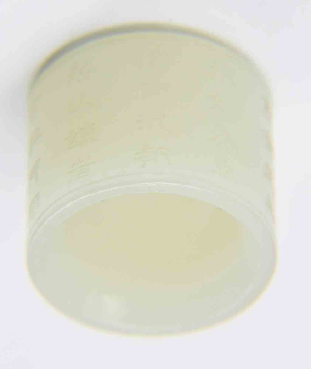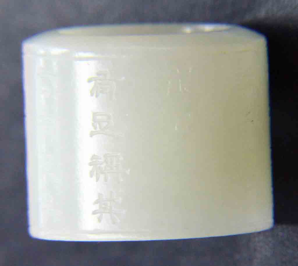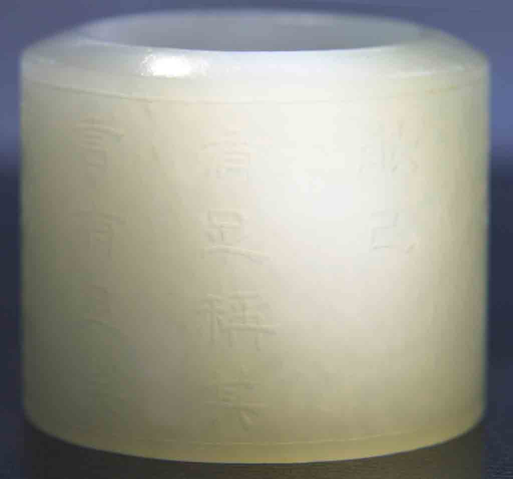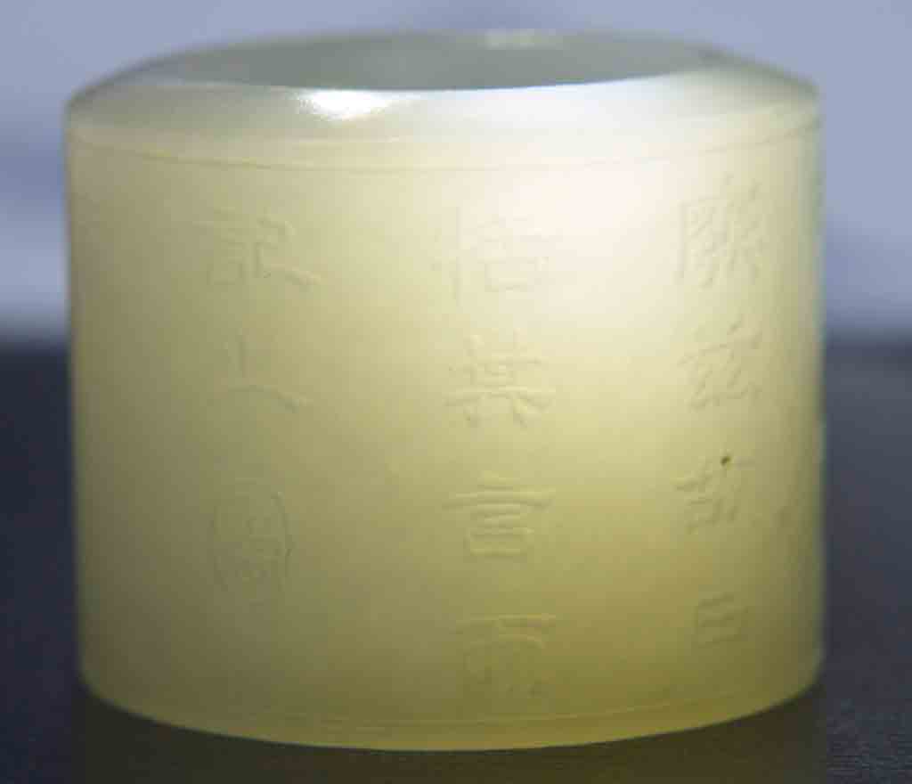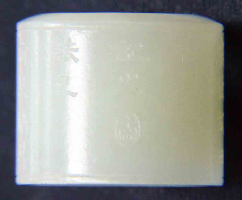 民國時期「子岡」款和闐白玉扳指 圖文:陳宗嶽 3公分直徑*後0.5公分*高2.3公分 鐫刻文字為: 能己 有足稱,其言有足矣,不妨為其立傳,而況執藝以諫者,古典所不廢,茲故曰括其言而記之。 語出:乾隆十有八年「御製玉盃記」。 玉盃記。玉盃有鼂其采。紺其色。而璘璘其文者。驟視之若土華剝蝕。炎劉以上物也。撫之留手。餰食非内出。以眎玉工姚宗仁。曰。嘻。小人之祖所為也。世其業。故識之。然則今之偽為漢玉者多矣。胡不與此同。曰安能同哉。昔者小人之父。授淳煉之法。曰。鍾氏染羽。尚以三月。而況玉哉。染玉之法。取器之紕纇且惌者。時以夏。取熱潤也。熾以夜。陰沈而陽浮也。無貴無瑕。謂其堅完難致入也。乃取金剛鑽如鐘乳者。密施如蠭蠆。而以琥珀滋塗而漬之。其於火也。勿烈勿熄。夜以繼日。必經年而後業成。今之偽為者。知此法已鮮矣。其知此法。既以欲速而不能待。人之亟購者。又以欲速而毋容待。則與圬者圬牆。又何以殊哉。故不此若也。宗仁雖玉工。常以藝事諮之。輙有近理之談。夫圬者。梓人雖賤役。其事有足稱。其言有足警。不妨為立傳。而況執藝以諫者。古典所不廢。茲故櫽括其言而記之。乾隆十有八年。歲在癸酉(西元一七五三年)暮春月。御製并書。(行書)。