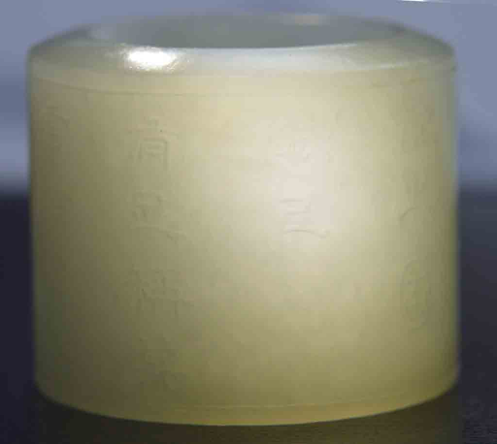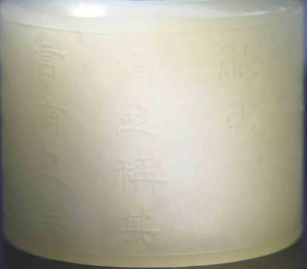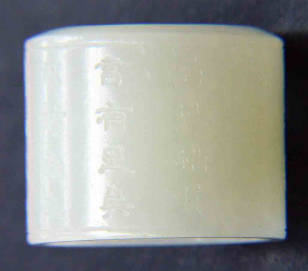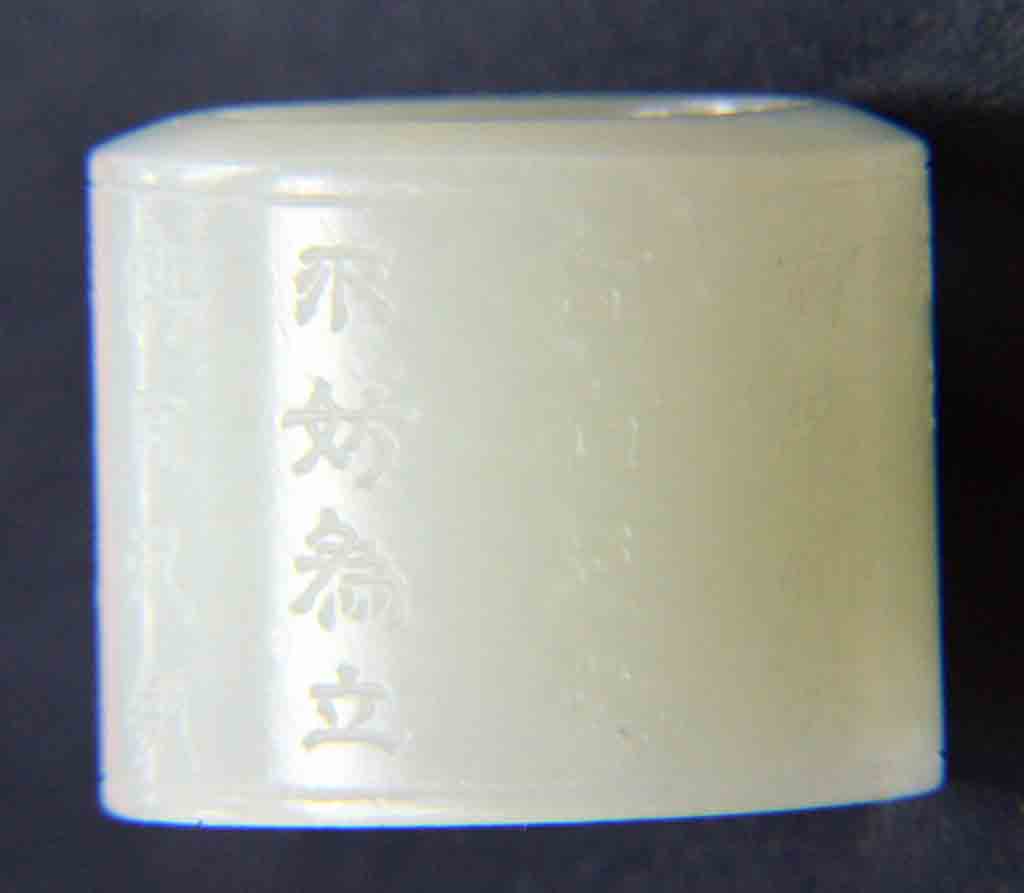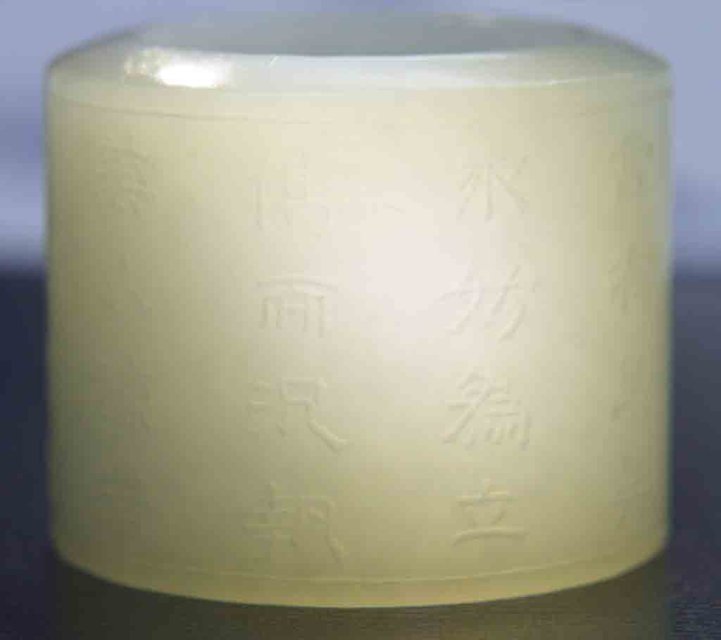 民國時期「子岡」款和闐白玉扳指 圖文:陳宗嶽 3公分直徑*後0.5公分*高2.3公分 鐫刻文字為: 能己 有足稱,其言有足矣,不妨為其立傳,而況執藝以諫者,古典所不廢,茲故曰括其言而記之。 語出:乾隆十有八年「御製玉盃記」。 玉盃記。玉盃有鼂其采。紺其色。而璘璘其文者。驟視之若土華剝蝕。炎劉以上物也。撫之留手。餰食非内出。以眎玉工姚宗仁。曰。嘻。小人之祖所為也。世其業。故識之。然則今之偽為漢玉者多矣。胡不與此同。曰安能同哉。昔者小人之父。授淳煉之法。曰。鍾氏染羽。尚以三月。而況玉哉。染玉之法。取器之紕纇且惌者。時以夏。取熱潤也。熾以夜。陰沈而陽浮也。無貴無瑕。謂其堅完難致入也。乃取金剛鑽如鐘乳者。密施如蠭蠆。而以琥珀滋塗而漬之。其於火也。勿烈勿熄。夜以繼日。必經年而後業成。今之偽為者。知此法已鮮矣。其知此法。既以欲速而不能待。人之亟購者。又以欲速而毋容待。則與圬者圬牆。又何以殊哉。故不此若也。宗仁雖玉工。常以藝事諮之。輙有近理之談。夫圬者。梓人雖賤役。其事有足稱。其言有足警。不妨為立傳。而況執藝以諫者。古典所不廢。茲故櫽括其言而記之。乾隆十有八年。歲在癸酉(西元一七五三年)暮春月。御製并書。(行書)。