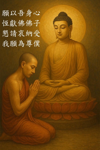 願我以身供佛,以心奉法;願此生命化為無盡供具,成為諸佛悲願之舟,度脫無邊眾生。願我恆為佛僕,不退不懈,清淨無染;願身口意三業,恆行於利他菩提之道。願此供養功德,遍施法界,願眾生同登覺岸,共證菩提。