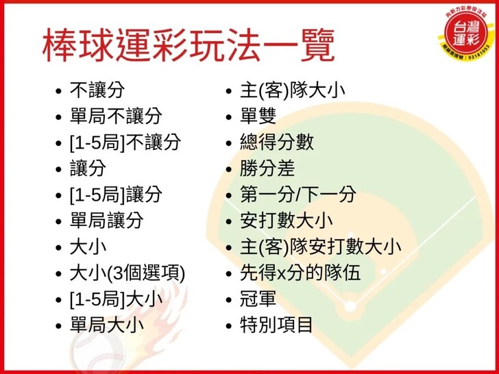 MLB運彩玩法MLB運彩提供多種投注選項,以下是一些常見的類型: MLB運彩玩法|勝負投注(不讓分)最簡單的投注形式,只需預測哪支球隊會贏得比賽。 MLB運彩玩法|單局不讓分預測特定單局的勝負。 MLB運彩玩法|1-5局不讓分預測前五局的勝負。 MLB運彩玩法|讓分投注預測某隊能否在設定的分差內贏得比賽。 MLB運彩玩法|1-5局讓分預測前五局的讓分結果。 MLB運彩玩法|單局讓分預測特定單局的讓分結果。 MLB運彩玩法|大小(Over/Under)預測比賽的總得分是高於還是低於博彩公司設定的分數線。 MLB運彩玩法|大小(3個選項)總得分有三個選項,通常是小、中、大。 MLB運彩玩法|1-5局大小預測前五局的總得分。 MLB運彩玩法|單局大小預測特定單局的總得分。 MLB運彩玩法|主(客)隊大小預測主隊或客隊的總得分。 MLB運彩玩法|單雙預測比賽的總得分是單數還是雙數。 MLB運彩玩法|總得分數預測比賽的最終總得分。 MLB運彩玩法|勝分差預測贏球隊伍的勝分差。 MLB運彩玩法|第一分/下一分預測哪隊將獲得第一分或下一分。 MLB運彩玩法|安打數大小預測比賽中安打的總數。 MLB運彩玩法|主(客)隊安打數大小預測主隊或客隊的安打數。 MLB運彩玩法|先得x分的隊伍預測哪支球隊先得到指定的分數。 MLB運彩玩法|冠軍預測賽季或系列賽的冠軍隊伍。 MLB運彩玩法|特別項目針對特定事件或球員表現的投注,如某球員是否能擊出全壘打或投手的三振數。