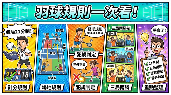 前段輪次爆冷空間較大,後段輪次則更考驗體能與抗壓能力。從投注角度來看,輪次不同,判斷邏輯也會不同。 五、羽球規則快速複習三局兩勝制羽球採三局兩勝制,每局 21 分。 這個規則讓局末變數極大,20 分後的每一球都可能成為轉折點。 五大項目