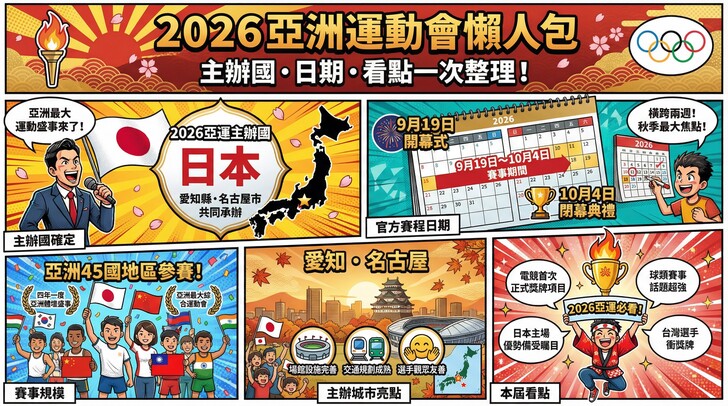 二、2026 亞運主辦國與比賽日期一次看2026 亞運主辦國2026 亞運主辦國確定為 日本,由愛知縣與名古屋市共同承辦。日本曾多次舉辦大型國際體育賽事,場館規劃、交通動線與城市接待經驗成熟,整體賽事環境相對完善,無論對選手或觀眾而言,都具備高度便利性與專業度。 2026 亞運日期根據官方公告,2026 亞運日期為 2026 年 9 月 19 日至 10 月 4 日。為期將近兩週的賽程,涵蓋開幕典禮、各項正式比賽與閉幕式,是亞洲體壇秋季最重要的焦點時段。 三、2026 亞運會項目完整分類本屆亞運項目橫跨多元類型,涵蓋傳統競技與新世代運動,主要可分為以下幾大類: 一、田徑與體能類項目 二、水上與戶外運動 三、球類團隊運動 四、技術型、對抗型與亞洲特色運動四、技巧與技術型運動 五、格鬥與對抗運動 六、體操與表現型運動 七、亞洲特色與傳統運動 更多運彩投注方法文章請到 >> https://8-sport.com 台灣運彩會員註冊 請到 >> https://channel.sportslottery.tw/
