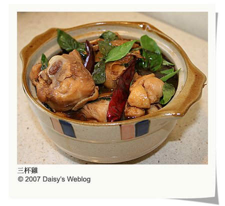 最近好像越來越懶得作飯了,常常希望看看有沒有什麼食譜是所有的材料都倒進去,蓋子蓋上去,五分鐘就可以上桌的菜。前天試了一下這份三杯雞食譜,真的是十分簡易,味道也不錯!只不過聶先生不愛吃腿肉,希望我下回能改用雞胸肉。@_@