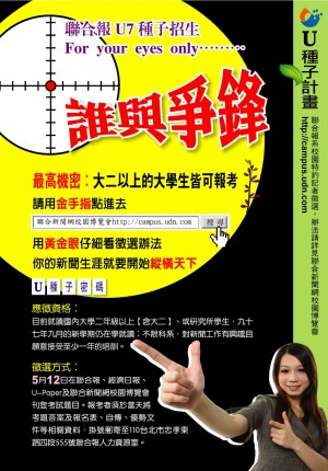 提醒:U種子徵選試題,將於5月12日公布,敬請留意! 年輕,是希望,也是力量。聯合報系看到了年輕的希望,更要借重年輕的力量。過去六年,聯合報系推動國內首創的校園特約記者(U種子)制度,獲得各界熱烈迴響,並已成為國內媒體培育年輕新聞工作者的標竿,上百個種子已開花結果。今年,新的U種子正要萌芽,您的加入將是個人生涯規劃的美好起步,也是聯合報系的榮耀。 【應徵資格】 目前就讀國內大學二年級以上(含大二)、或研究所學生,且九十七年九月的新學期仍在學就讀;不限科系,對新聞工作有興趣且願意接受至少一年的培訓。 【徵選方式】 徵選將分兩階段進行。 .第一階段初試:主辦單位將在5月12日在聯合報、經濟日報、U-Paper及聯合新聞網校園博覽會(http://campus.udn.com)刊登考試題目或連結網站(聯合新聞網校園博覽會公佈時間是00:07am)。報考者依規定完成作答,試卷連同報名表、自傳、優勢文件(請製作清單,若有影音作品請附光碟)等資料,須在當天(郵戳為憑)掛號郵寄或送達110台北市忠孝東路四段五五五號聯合報系人力資源室收。信封上請註明「應徵校園特約記者」。 .第二階段複試:預計在6月27日。通過初試者另行通知。 【錄取名額】 正取30名,備取若干名。 【報到日期】 八月一日報到,隨即開始暑期實習,未報到者視同放棄。 【權利與義務】 .錄取者需參加共六週的寒、暑期實習及相關訓練課程,實習期間可支領交通津貼,另有意外保險等福利。 .除實習期間有專人指導外,本報系另請資深優秀記者,負責全年的輔導及諮詢。 .實習報到日起為期一年,U種子可用本報系校園特約記者的名義,參與本報系報紙及網路媒體的校園新聞採訪撰稿,稿酬從優,特殊表現另有獎勵。 .培訓一年期滿,已畢業可進入職場者,經本報系評定表現優良,通過面試後,可進入本報系任職。 【報名表下載】 |