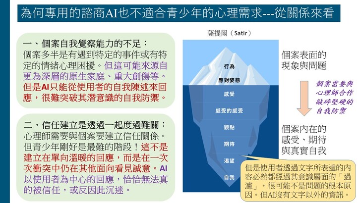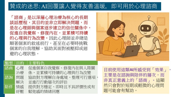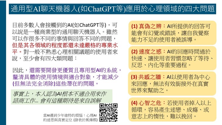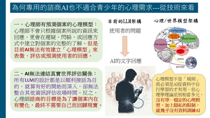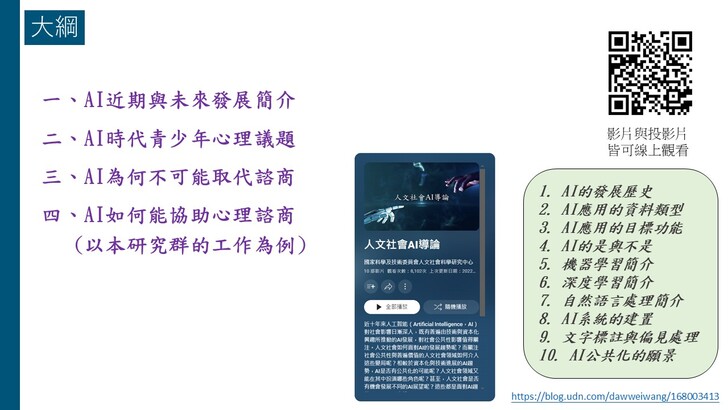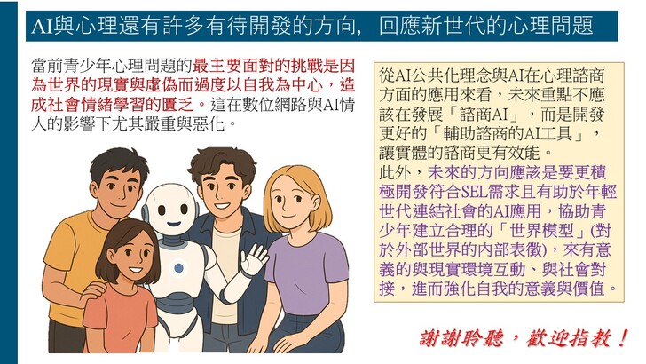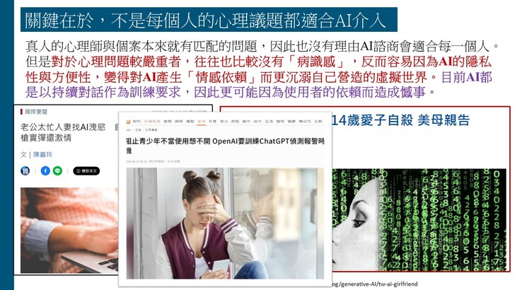 感謝新竹輔諮中心的邀請,讓我有機會向高中端的心理師分享這個重要的主題。但是不同於以往,此次我加入更多我們AIFR研究群近期開始落地實踐的部分心裡AI系統(例如AI諮商助理小慢,以及AI個案模擬系統),希望未來能幫助AI更好的應用在青少年的諮商輔導,讓他們在AI時代也可以有更好的心理健康資源。除了約30多位現場參與的心理師以外,感謝另有超過300位各地的同仁線上參加,有許多豐富的討論與回饋。 依照往例,此處為此次活動的錄影與投影片對外公開,希望能有助於更多朋友了解這個重要的議題。未來幾個月還會有不同的機會在其他地方有這類演講,也希望能同步更新我們所做的相關工作,可以藉此得到更多回饋並促進相關的發展。也請各界專家學者不吝指教,也網友歡迎自行分享。 演講摘要: 本次演講聚焦於人工智慧對青少年心理健康的影響,以及其在心理諮商領域中的適切定位與應用可能。首先,當前生成式AI本質上仍是基於大量資料關聯與機率演算所建構的語言生成系統,並不具備真正的主體意識、情感或心智狀態,卻可能因其高度擬人化的效果,讓人「以為」有情感或心智。當AI被應用於涉及人類經驗、社會價值與文化規範的心理與諮商領域時,其表現更會受到既有資料偏見與社會結構限制的影響,不應該期待AI給出超越人類的智慧、公平或同理心,而是應該著力在如何節省次要但重複事務的工作時間,提升更重要的人性價值。 在青少年心理議題方面,演講進一步從世代處境與社會環境變遷切入,指出Z世代青少年所面對的困境,並不僅是科技使用所造成的表面問題,而是更深層地反映出當代社會的高壓、疏離、虛實混雜與未來感匱乏。講者認為,青少年所呈現的焦慮、孤獨、自我價值不穩與人際退縮,往往與現實社會中缺乏可依附、可信任、可投入的真實連結有關,而不宜簡化為「沉迷網路」或「缺乏抗壓性」的個人問題。從這個角度看,AI時代下的心理健康挑戰,其實涉及整體社會結構、生活節奏與人際互動模式的改變,也使青少年在自我探索與身份認同上承受更高的不確定性。 在此基礎上,演講明確主張AI不可能取代真正的心理諮商。心理諮商的核心不僅在於語言回應本身,更在於心理師與個案之間逐步建立的信任關係、對真實生活情境的整體理解、對潛在防衛與情緒脈絡的辨識,以及在關鍵時刻作出專業判斷與倫理承擔的能力。AI或許能在表層對話中提供某種陪伴感,甚至因其快速、順從與擬人化特質而讓使用者誤以為自己被理解,但這種互動並不等同於真正的諮商歷程。若過度依賴AI,反而可能延誤高風險個案進入專業協助體系的時機,並衍生依附、誤導或情緒替代等倫理問題。 最後,演講並未將AI視為心理專業的對立面,而是強調其作為「輔助工具」的實務價值。以研究團隊的工作為例,AI可被應用於社群平台自我傷害風險文字偵測,協助及早辨識高風險訊號,作為校園或相關單位預警與轉介的參考;也可作為正式諮商前的前導式對話工具,協助學生在較低壓力且具保密感的環境中先行梳理情緒與困擾,提升後續面對面諮商的效率;此外,亦可透過本土資料訓練模擬個案系統,支援實習心理師在訓練過程中的會談演練、評量與督導。這些應用共同顯示,AI較適合被定位為提升效率、擴充訓練資源與支援前端辨識的技術工具,而非取代人際關係與專業判斷的主體。 總結而言,本演講的核心觀點在於:面對AI技術快速發展,心理與諮商領域真正需要思考的,不是如何發展出能取代心理師的「諮商AI」,而是如何在清楚掌握AI限制與風險的前提下,將其導入適當且可控的輔助場景之中。更進一步地,講者也提出未來可朝向社會情緒學習(SEL)相關應用發展,讓AI不只是回應個體情緒,而能協助青少年培養情緒辨識、同理互動與社會連結能力,進而重新建立與真實世界之間更健康、更有意義的關係。 演講錄影Youtube網址:https://youtu.be/0PC1CQ4nmg8 Helix 02 Living Room Tidy https://www.youtube.com/watch?v=CAdTjePDBfc