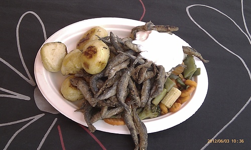(九) 到了港口旁邊的市集廣場,有許多攤位自賣各種小雜貨與簡餐。反正早餐也還沒吃,就點了一盤道地的海鮮(小魚)、蔬菜、配馬林薯,覺得非常好吃。