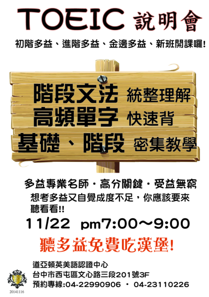道亞頓將於11/22(六)晚上7:00~9:00舉辦多益說明會,歡迎同學們踴躍參加!