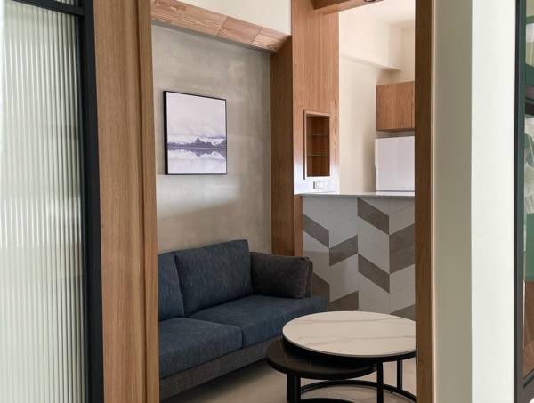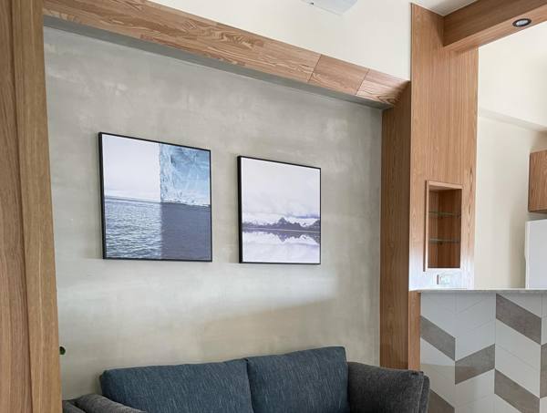 老屋改建 室內設計 老屋翻新 將沙發上的樑用斜角巧妙做修飾, 並用和吧台一樣的木皮, 會達到延伸的效果^^
