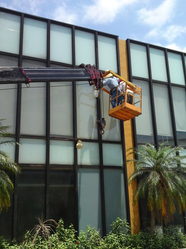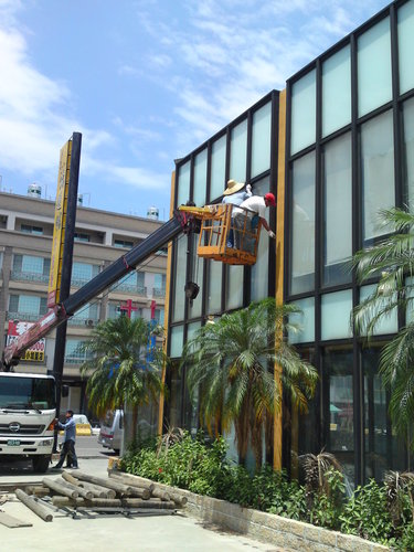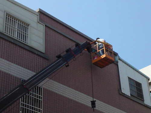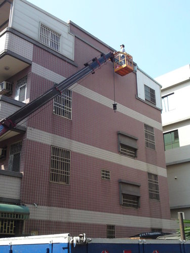 施作防水工程-搭鷹架和使用吊車哪個便宜?? 我們接了很多外牆防水工程的案子, 我們會衡量施工處的空間和工作的天數來決定工法. 如果工作天數不會超過兩天, 現場也有吊車足夠進出的空間, 使用吊車施工會比搭鷹架來得便宜. 但若工作天數會超過2天, 搭鷹架就會比較便宜了. 吊車或搭鷹架都是施作高雄防水工程的過程需要, 因此要以經濟實惠的方式處理. 對了~上一篇文章談到磁磚的防水, 如果不想改變磁磚原有的花樣, 也可以用透明的磁磚PU.