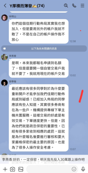 2、當被害者上鉤後,歹徒會介紹其他「客服、老師、助理」同夥加 LINE 聯繫或加入LINE投資群組,並提供假投資網站或App給被害人註冊、下載安裝及操作,此時LINE群組內不斷有其他假學員獲利貼文。