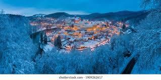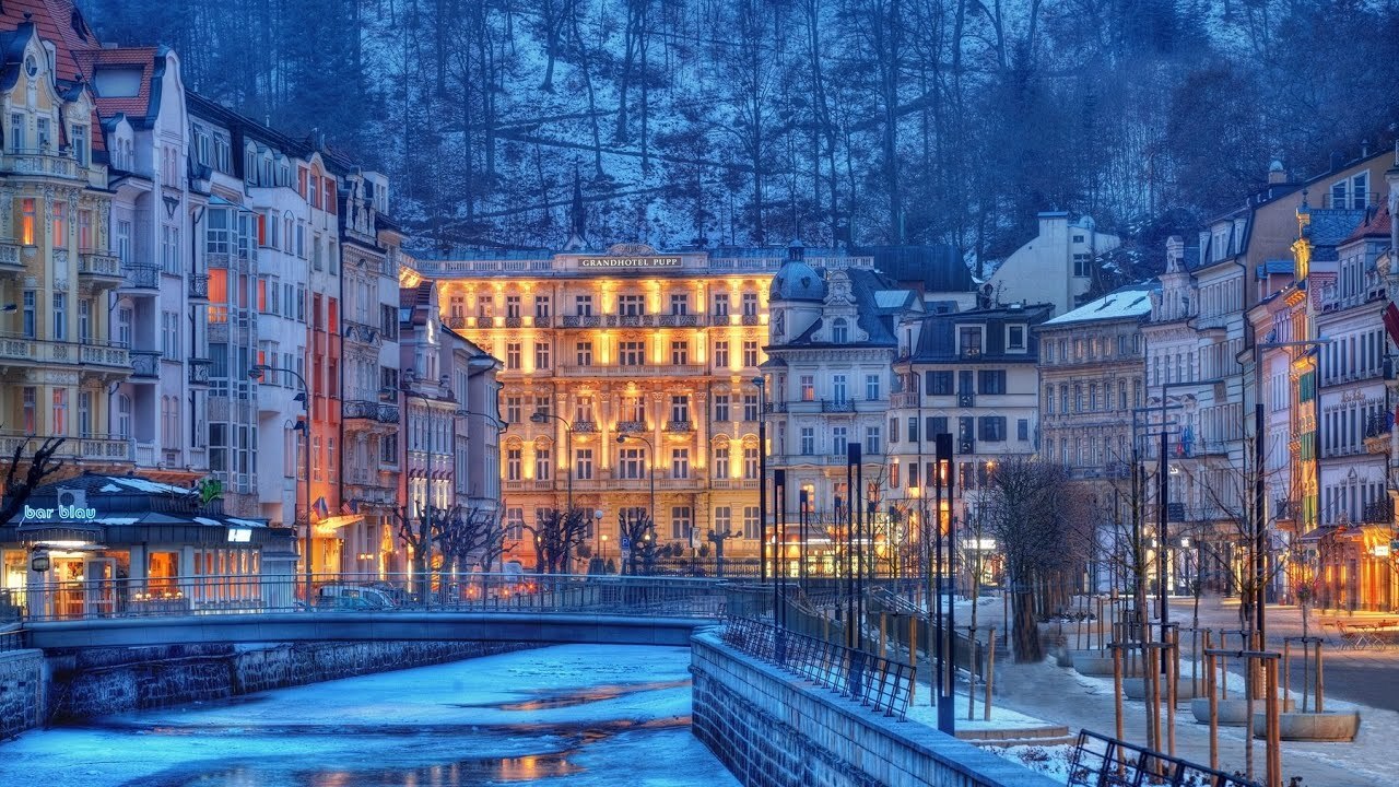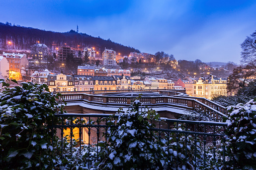 .Winter in Karlovy Vary. The embankment of the Tepla River in Karlovy Vary, Czech Republic..........Karlovy Vary in winter offers a magical, peaceful experience with snow-dusted Art Nouveau architecture, festive Christmas markets (late Nov-Jan 6), and sparkling colonnades, perfect for wellness with its famous hot springs amidst frosted hills, with activities like hiking, ice skating, and enjoying thermal baths making it a charming, less crowded escape from Prague, despite cold temps (avg. highs around 34-39°F). .