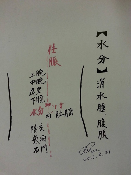 任督二脈中的「任脈」,位於人體胸腹部的正中線,是慢性保養的脈絡,而「水分」就位在任脈中的上腹部正中線上,約肚臍上一吋,主治腹部不適、腹脹、水腫及小便不利等。