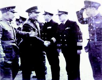 | 胡宗南(左)陪同彭孟緝(左二)巡視部隊,絲毫不介意「小學弟」成了「大長官」。 圖/胡為真提供 |