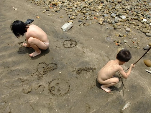 姐弟倆在沙上畫圖