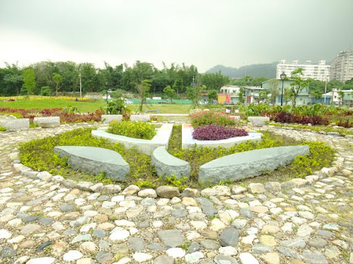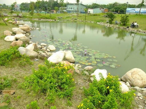 景觀雨水池看起來像一個一個小池塘,裡面還種有蓮花,還是荷花,我不確定,不過,看起來蠻有感覺的。再過去,是縣徽花園。園區的最邊邊,是自行車賽道,有小朋友正努力地在賽道上練習著。