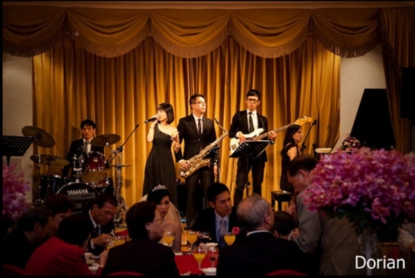 台北國賓飯店婚禮晚宴 -婚禮演奏 樂團編制為爵士樂五重奏 主唱 鋼琴 薩克斯風 bass 爵士鼓