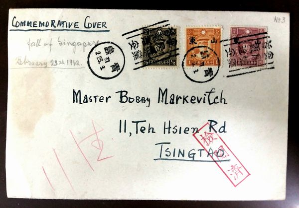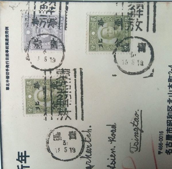 近日整理郵品,找到一張日本同好加藤高広先生於2013年寄來之自製賀年片,加藤兄以個人所收藏之華北半值票青島本埠平信實際封為圖,此封是目前僅見之半值違規提早使用例,成為加藤兄引以為傲之藏品,乃當然之事。 1941年7月1日起,華北當局陸續發行五省小字與大字加蓋票,自是與汪偽華中及重慶國府郵政體系分道揚鑣,1941年12月8日,太平洋戰爭爆發,英美與重慶國府正式與日本宣戰,日方也因此無法再對國府法幣進行貨幣戰,於是將重心擺在華北與華中兩區偽幣,以及華中華南日本軍票與中儲券匯率之上,1942年初,大致決定華中中儲與華北中聯之匯率為2:1,此外在汪政權強力要求下,日本亦大致同意逐步取消停用極度讓人詬病的日本軍票,讓中儲券成為華中與華南之官方強勢貨幣。為彰顯華北地區在日本控管之下,社會經濟之相對穩定,華北郵政以新訂之比例發行新郵,以華北字樣取代五省省名,並就郵票面值折半改值,並於1942年5月撥發華北各局,於6月1日起正式發行使用。 加藤所藏這封,為1942年5月15日青島本埠超前半個月使用,屬違規行為,不過一位美國郵商於前幾年拿出不少同一位收件人的郵品出售,除加藤這件外,筆者亦收到一些,其中有關折半票者,多為紀念性質之集郵消印封,不過就此些郵品看來,仍有高度郵史價值,一則華北折半票在正式發行前流出者,多集中在青島一地,在就流出品種看,多為低值之中華2分改1分、8分改4分、16分改8分、以及港烈4分改2分等品種。 這封信寄往青島德縣路,德縣路大有歷史來頭,為德國佔領膠州時所規劃,乃青島地區別墅最密集之地,1938年日本在此導演一場德縣路事件,不過沒有成效。日本占領時期,軸心國籍人士與不少流亡之白俄聚集於此。這封信的收件人Bobby Markevitch,經筆者查閱當時期青島外商名錄記載,確實為德縣路11號之主人,應該是名白俄商人,就其製作之大量郵品看來,也應該是位郵家。