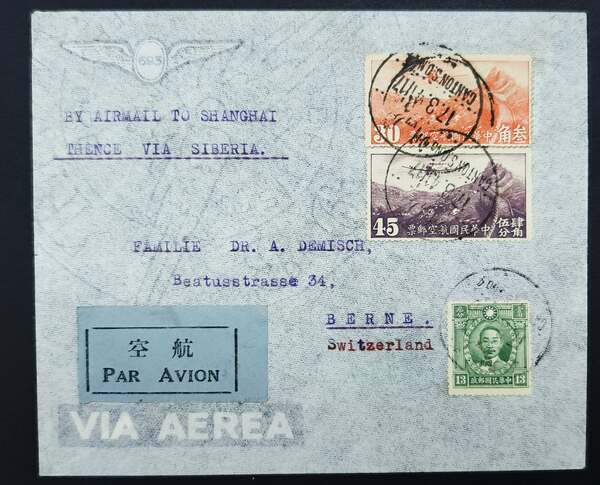 1940年4月1日,偽中華航空正式開辦廣州至上海間之定期航班,另一方面,日偽廣東郵政管理局與郵政總局駐滬辦事處,就該航班郵件載運與郵資制訂亦達成郵政協定,即兩地各依日本軍票兌換法幣之比率收取日金20錢/20克重航資,廣東方面為法幣26分,上海華中方面為25分,並規範自4月6日起實施。 隨著各地日本軍票與法幣比率的調整,華中與華南方面就航資進行多次的應對調整,廣東方面於1940年12月中調資至31分,2月初調至32分,2月中又因廣州至汕頭、廣州至海口航線之先後開通,復將航資上調至34分,3月1日起,華南華中同歩上調航資至36分,到了4月21日,上海方面再調航資,廣東方面雖也上調,但已與上海不同調,直到1942年初才統一改日金收費,這是搞日占航空郵政歷史最為困難的部分。 前不久好友謝明書兄提供其收藏之31分航資封於1941年2月2日的使用例,讓這段31分航資的使用期程向後修正至2月初,又謝兄所贈本人之36分航資封於1941年3月24日之使用例,讓此36分廣東航資使用期程更為完整,再次感謝明書兄對此難搞的日偽廣東航空郵史研究提供出巨大的貢獻。 本次提供的1941年3月17日廣州寄瑞士航空至上海航空封,顯示出這段航線之航資為38分,早年我的看法是超貼2分,故不予留意,然日本同好亦收有3月19日同資使用例、海外拍行亦曾出現過3月20日經上海寄德國同資實寄封,倘若只是單一個案,或可視之為超貼,但如此罕見的廣東航空實例,加之有3件案例,讓我不得不予正視。再者,廣東航資調整在1941年12月底前,其調資之頻率本就比華中次數為多,且華中亦曾出現上調後再下修(40分調為35分)之案例,故不排除此38分廣東航資的存在。 在取得更多實例之前,就目前案例,此38分航資的執行時間暫落在1941年3月16至20日間,是時廣東軍票比率波動較大,加上日偽於華南所控制之地區範圍本就較華中地區小,短期調資反映匯差不無可能。 學不能無友,希冀各路同好也能提供藏品指導賜正,讓這段高難度的日偽郵史更臻完備。也再次感謝明書兄的幫助,讓這條研究路不致過於孤獨無助