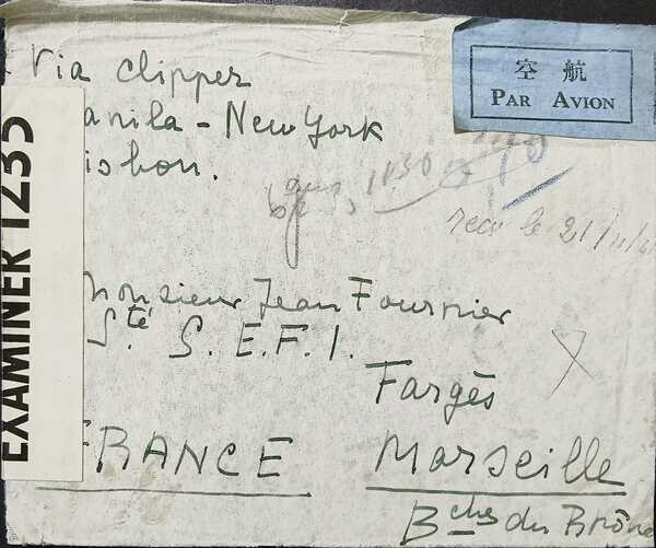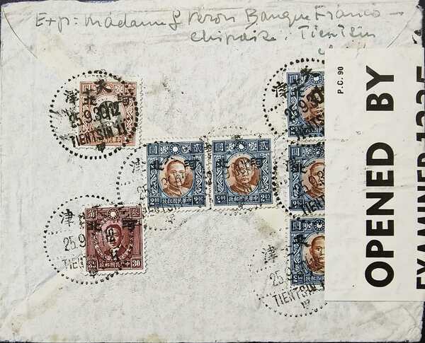 1941.09.25天津寄維琪法國泛美兩洋航空封 1938年8月15日,日偽當局成立華北郵政總局後,華北淪陷區郵務雖仍接受國府支配,但日偽當局漸次掌管郵政事務,加之日本於中國各淪陷區大打經濟戰,以日本軍票及各政權偽幣人為打擊法幣幣值,故華北郵政事務與決策與國府逐漸脫鉤,1939年9月1日,國府調高國際信函郵資與各歐美航空資費時,華北當局便是以兩地貨幣幣值落差為由,拒絕配合調整國際信函與航空資費,這是國府與華北郵政當局的首次決裂,直到1940年9月23日,兩地郵政才勉強的短暫整合,但國際航資仍不同調。 此封貼河北大字票計11.3圓中聯幣值票,1941年9月25日由天津寄維琪法國的馬賽,依寄件人的郵路指定,交泛美航空由馬尼拉至紐約再到里斯本,郵資結構為6克重信函5角加上泛美兩洋寄歐州航資5.4圓×2=11.3圓,若以法幣來算,華北等於要較華中多花上一至兩倍價,方能寄出這封信。 值得注意的,是1940年7月10日維琪法國成立之時,世界各國,包括中華民國在內皆予以外交承認,唯獨英國不予承認,加之歐戰爆發後,英國於本土及海外領地加強郵政檢查工作,按理這封信由美國送達中立國葡萄牙後,郵件可直接轉遞至南法,但就封上所貼英國本土 使用之P.C郵檢封條看來,這封信到達里斯本後並未直接轉遞法國,而是交由英國當局實行了郵政檢查。