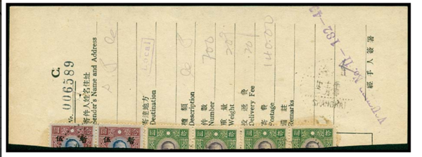 1943.11.22 上海大宗印刷品郵件詳情清單 本期台灣遠東郵拍得標之淪陷區郵史小物,清單貼加蓋暫售50圓票兩枚,以及大東原值10圓票四枚剪半票,就詳情單上記載看,為每件20分郵資之本埠印刷品封,一共交寄700件,郵資總價為汪偽中儲券140圓,此類詳情單在多年前由國外藏家手中回流不少,多數為國府郵政用單,少數為汪偽郵政用單,大致上價格不高,但對於郵政史藏家而言,對於郵資部分具有補強之功能。 眾所周知,在汪偽政權全面接收中華郵政之後,更積極與日本商談有關中儲券全面使用與停用日本軍票諸事宜,最後日本方面妥協,確立汪偽中儲券為華中華南之主流貨幣,並確立華中中儲與華北中聯18:1之對價關係,因此,自1943年11月1日起,汪偽正式發行以中儲收費之暫售改值加蓋票,同日更調整郵政資費,國際信函郵資由1.5圓/20克上調為2圓。國內郵資亦同步調漲。 首批暫售加蓋票之票值,大抵以新郵資之需發行,最小票值為25分,最大為50圓,次高者為2圓,以1943年汪偽物價指數看,這50圓票值非常高,除保價郵件外,就屬此類大宗交寄郵件才有機會用上,故此件可謂首批暫售高值票之發行首月使用最佳案例。 此外,上海為我國郵件事務最活躍之地區,然國人長期忽視汪偽歷史,有關汪偽郵政時期之郵資史料至今仍難全得,特別是稀少郵資,如印刷品郵資便是其一,1943/11/01-1944/05/15這段時期之印刷品郵資便是如此,日本知名郵家加藤高广兄記載此時本埠印刷品資費為15分,不少大陸郵家主張為25分,當然,言之要有物方能服人,粵港名家麥國培兄在其華東郵政資費郵集中便收有一件20分本埠印刷品實寄封,本人亦收有本埠20分與外埠40分之實物,今天這件印刷品20分詳情單,更能證明此資之正確性,郵史價值極高。 附上麥國培兄20分印刷品實寄郵件貼片,希同好們共同研討時能有所幫助。