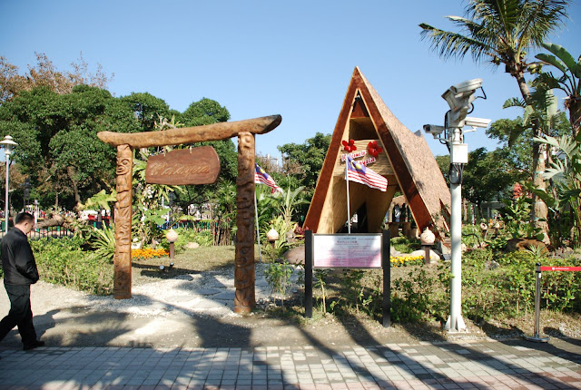 馬來西亞位處熱帶地區,四季氣候高溫潮濕,涼亭廣泛成為居民避暑及休閒活動的場所。本作品以改良自馬來西亞傳統屋頂,融合現代手法,以竹子為構材,就地取材,充分展現生活與環境之環保與和諧。 改良式屋頂,以竹子為構材。天氣熱時可來此乘涼休憩。 以熱帶花木佈置成的熱帶風情。 庭園綠地。構件包含了椅子、鞦韆、平衡木、藤球運動場等,是採用天然木材呈現。