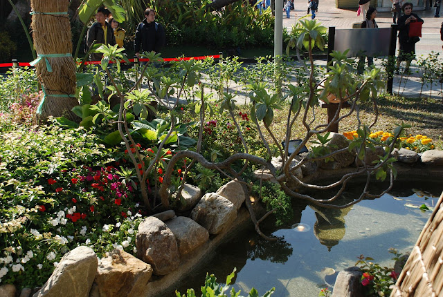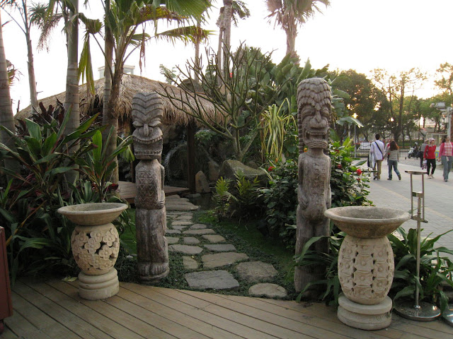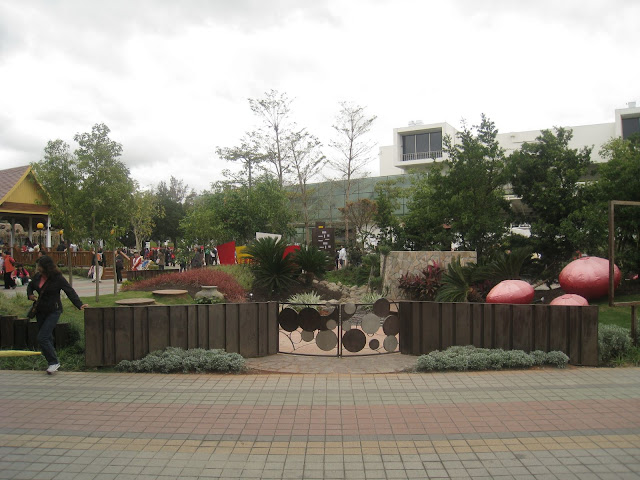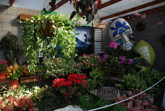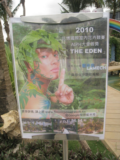 重塑白色沙灘、藍色瀉湖以及翠綠椰林....這正是彩虹的故鄉-帛琉的象徵,而豐富的海洋生態,更使帛琉成為舉世聞名的觀光聖地。其中珍貴稀有的「巨人蚌」(又稱硨渠貝)更是帛琉諸多神話發想的起源,與帛琉人的生活與文化息息相關。本次設計師藍米克以帛琉進口的巨人蚌應用於庭園中;以自然呈現生態、讓海洋生態融入庭園造景中,期望能使參觀的民眾感受與經驗帛琉原色原味的生命力。 這位設計師藍米克,在爭豔館的國際室內花卉競賽中 (作品名稱:伊甸園) 獲得多項獎項,而在寰宇庭園區也參與了帛琉和夏威夷庭園的設計。我個人很喜歡他的作品。 帛琉庭園運用了多種鮮明色彩與當地文化的添點,吸引不少人駐足觀賞。