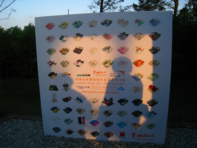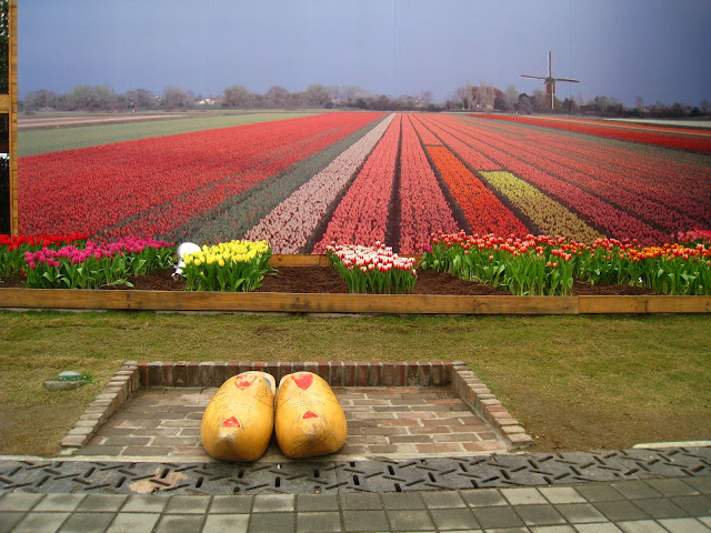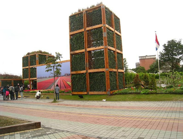 近年來各國都會興起推廣綠色空間和植栽,此國際性運動是基於「綠城市」的哲學理念,相信綠色基礎建設能為社會、經濟和環境創造重要效益;而此哲學和運動的興起乃源自於荷蘭在2002年世界園藝博覽會所提出並啟動的都市意象。 由於荷蘭庭園是遊客的重點觀光庭園,因此相片放得比較多一點。 這雙荷蘭木鞋是每個人必照的景點。 聽到有人說花博騙很大,拿背後的相片打鬱金香花海的廣告,其實明眼人一看就知道後面是照片而已啦~ 真正的主角是前面整齊排列的花兒。不過鬱金香花期很短,花農會換上不同的花卉來取代。 荷蘭木鞋藝術創作義賣活動。裡面展示許多彩繪造型木鞋,十分有趣;不過現在展期已過。 近期則在樑柱上架了兩輛腳踏車,代表荷蘭為自行車運動王國。 荷蘭庭園很大,這是從後面看過去。 有一排木椅擺在花園裡,讓遊人愜意地休憩。