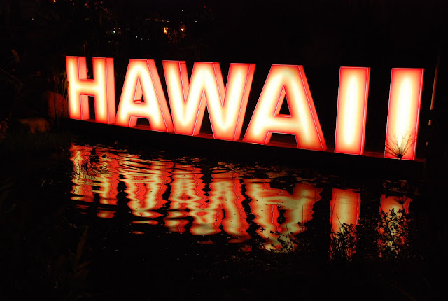 夏威夷因四季和煦,收集了來自世界各地的珍奇植物,融合成獨樹一格的造園特色- 從天橋望下看,夏威夷庭園有著濃厚的熱島風味。 茅草屋及原住民雕刻。 另外還提供了液晶電視播放觀光宣傳片。夏威夷女郎在夕陽下熱情搖曳著。