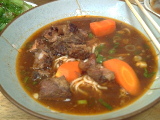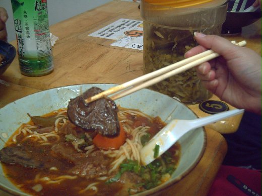 考完後就跟我的好麻吉以及老爸老媽一起去玩耍,目標是北投的行義路溫泉巷,不過在前往泡湯之前,先來填飽大家的肚子祭祭五臟廟吧! 於是在靠近石牌捷運站的出站口左側就看到我家老爺子的最愛牛肉麵店,沒想到看起來不怎樣的店面,竟然還是台北市牛肉麵店節票選前30大好吃牛肉麵喔!這家名為牛董牛肉麵到底好不好吃呢.... 非常好吃!肉大塊又很嫩,湯頭味道十足,完全沒有偷工減料喔!重點是份量十足!小碗的紅燒半筋半肉牛肉麵以及紅燒牛腩麵可以讓兩個小女生的胃撐到超級飽,更何況是大碗,滿足了老爸挑剔又很龐大的胃口啊! 大陸妹也炒的非常清脆爽口,而且老闆跟客人的互動很好,還會跟客人聊起天來呢!在絡繹不絕的人來人往中,竟然有老闆如此的熱情,的確溫暖了大家寒冬裡的心。 話說當我們四個人挺著圓滾的肚子出去時,發現門口有對情侶,其中男生是外國人,竟然兩個人才吃一碗,當下我跟我的好麻吉相視而笑.... 嗯,我們還真是太會吃啦!但真的亂好吃的,大碗的麵140-160元,小碗的則為120元,麵條也相當的滑順,真不愧是票選出來的人氣名店唷! pic1.老爸開心的比YA!! pic2.紅燒半筋半肉牛肉麵小碗(感謝瑾小姐美麗的手) pic3.這是我吃的牛腩麵喔