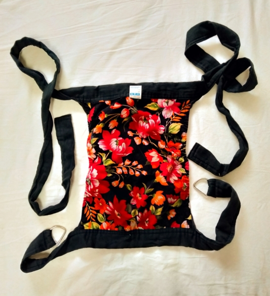 另一件是嬰兒揹帶—--長方形的黑底絨布面上,印著色彩繽紛、花繁葉茂的圖案,那一小塊布,是baby貼近媽媽身體,獲得安全感的小座椅。
