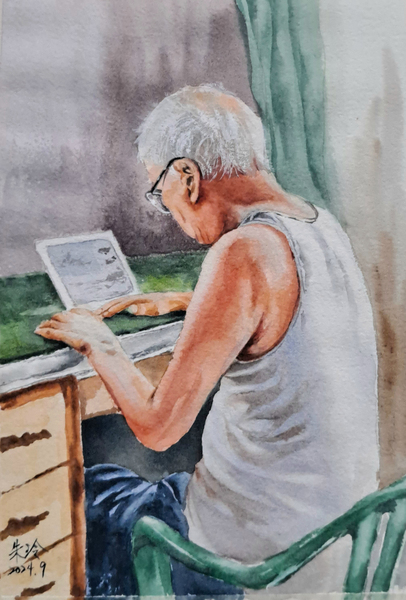 當年大學聯考失利,為了儘早完成學業,以便就業減輕家庭經濟負擔,我放棄補習重考,直接報考三專。放榜那天,爸爸等不及隔天的報紙公告與成績單通知,騎車載我從台南沿著省道到高雄,查看張貼在學校布告欄的榜單。費了好一番功夫搜尋到我的名字後,我們在路邊小攤吃了一碗剉冰,沁人心脾的滋味融化了焦躁與不安。之後,我們又沿著原路騎一個多小時車程回家。只是這次高雄的查榜之旅,交通工具已從當年的腳踏車換成了機車。不變的是,在火傘高張、熱氣蒸騰的途中,爸爸襯衫被汗水熨貼在背後的身影。 第一次負笈北上求學,爸爸依舊陪著我坐上客運、拖著行李到校註冊。陌生環境對初次離開父母羽翼的我而言,既有展翅高飛的期待,也有獨自面對生活挑戰的恐懼。在一切安排妥當、殷殷叮嚀好好照顧自己後,爸爸轉身走出宿舍大門,望著他漸行漸遠的背影,九月的炙熱也逼出了我眼裡的汗水…… 緣於工作性質,訪問過許多優秀的藝術家,因喜歡水彩的清明透亮,進而激發了我學習水彩畫的興趣。多年來,在社區大學有一搭沒一搭地學習,加上不夠勤奮又非科班,我始終沒有勇氣挑戰人物肖像畫,因深知其難度極高。爸爸離世後,我常翻閱老照片或電腦裡的檔案照,竟也萌生了完成一張爸爸畫像的想望。 一天,突然想起那個炎熱的午後,我偷偷拍下爸爸穿著汗衫、戴著老花眼鏡專注滑平板的可愛影像,於是找出照片檔案、拿起畫筆,傾注最深的情感,一筆一畫細細描繪,完成了我第一張人物水彩畫。在五個多小時畫筆與顏料交疊的時光裡,我彷彿跨越了時空,重新與爸爸對話。當作品完成,思念的情緒似乎也得到了撫慰,即使過程中,數度筆下的畫面模糊了……