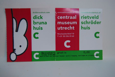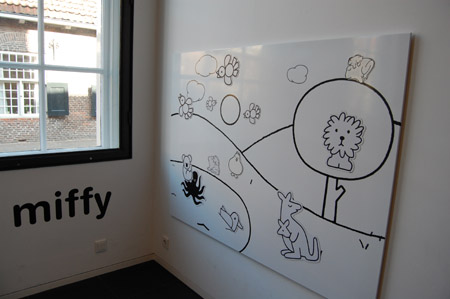 很久以前第一次去東京的時候,有一次逛到表參道上的Kiddy Land,看到架子上靜靜躺著一隻可愛的小兔兔,她的名字叫做「Miffy」。並不會特別喜愛卡通人物的我,莫名的對這個第一眼看到的陌生小兔子產生好感 - 我不知道她是一隻荷蘭兔兔,只以為她是像Hello Kitty般的日本兔 ; 所以看著她我心裡面還在想 - 奇怪,這隻小兔兔怎麼跟一般卡哇伊的日本卡通人物不一樣 ? 她的線條簡單,筆觸直接 ; 對很喜歡劉其偉爺爺的我而言,我想像中的作者,應該跟劉老有點像,有著豐富的人生及天真的心.. 回國後跟一些朋友提到這隻小兔兔,得到的回應不外乎 :「那是Hello Kitty的朋友」,原來大家都把她跟Melody混在一起了;或是大部分的人很乾脆的跟我說:「不知道!」。所以我只好自己做功課,查了半天才知道那是隻荷蘭兔,她的年齡比Hello Kitty大多了 ; 實際上,就是因為Miffy在日本很紅,所以日本人仿效Miffy而創造出Hello Kitty。不過這隻在世界各地小有名氣的兔子,很意外的在台灣一點都不紅,到現在大部分的人還是把她跟Melody搞混。還好前幾年每年都固定到日本充電,可以盡情的在日本買到Miffy的相關產品,滿足身為米飛迷的心。 當拿到我們這趟荷蘭行程的時候,深刻了解我喜歡Miffy的janet立刻msn跟我說:「什麼嘛..這次的行程根本就是為你規劃的。」我說:「反正我又沒去過荷蘭,什麼行程還不是都一樣..」janet說:「當然不一樣,台灣沒有幾個人知道Miffy,但行程竟然排了Dick Bruna Huis(Dick Bruna之家,又稱米飛兔博物館)..」 Miffy(米飛兔) - 是荷蘭插畫家Dick Bruna的作品,自一九五五年年問世以來,廣受世界各地兒童喜愛,目前已被翻譯成四十種語言,繪本並超過八千萬本的發行量。當初Dick Bruna創造Miffy的靈感是來自他說給兒子聽的床邊故事,他創造了一隻叫Nijntje(Miffy的荷蘭原名)的小白兔,是個小女生,愛穿裙子,有一群好朋友..