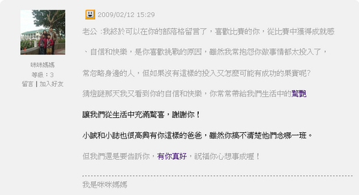 有時候覺得自己真的太投入一些東西,而忽略了太多身邊的人,包含您與小誠、小誌,記得在常春藤工作時,是我第一忽略的時間點,接著去讀研究所的教學碩士班,為了晚上上課及撰寫論文,造成我的第二忽略時間點,接著準備公立學校的教師甄試,又造成了第三忽略點,而第四個忽略點就是現在,接了行政,又是天下第一處的組長,然後又沒事去參加這個部落格大賽,所以竟然連自己兒子讀的班級給記錯了。 有時候您會抱怨我對電腦操作與網路投入太多,可是我也承諾您,我回到家後幾乎不用MSN,另外也不玩線上遊戲,我一定是進行網站維護或寫寫部落格及學校工作的準備。這一生中,很高興與您結為夫妻,而且我們也有一對可愛的雙胞胎兒子,對您的愛,有時候用言語與文字是表達不出來的,我在這個部落格本來想將我們的愛情故事快點寫一寫的,結果寫到第二篇,竟然有點寫不下去,因為心中對於過去這一段相處的夫妻之情,竟然有千千萬萬的感動,這個感動竟然是動筆的阻力。 謝謝您對我的支持,也謝謝您在九份買給我的兩份幸運物,不管結局將如何,反正老公已經努力過,而且也在這個競賽中獲得了許多成長及認識了不少的教育伙伴,今天是西洋的情人節,在此特別藉此表達我對您的愛,而且是很多人可以見證的愛喔,突然覺得當中國人有點小幸福,因為除了過西洋情人節外,還有中國情人節可以過,嗯,至少一年有五個我們值得慶祝的日子喔,除了這兩個節日外,我們還有結婚紀念日,我們兩個別的生日。 最後,獻上我的兩個大禮,給妳一生一世的幸福承諾: 給妳520顆 送妳1314朵 |