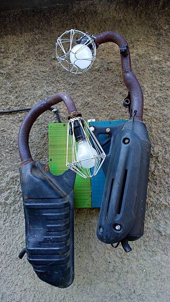 用摩托車排氣管製成的藝術裝置,上頭的燈泡意思是晚上可以當路燈?