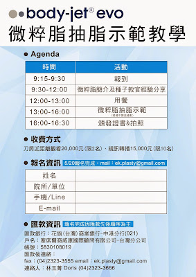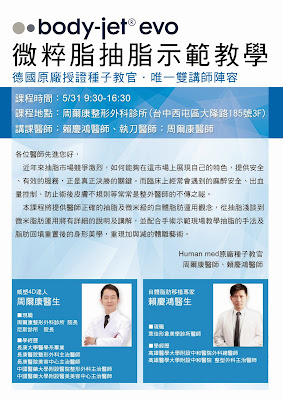 在TDAC大會演講之後,診所即將於5/31台中周爾康整形外科診所舉辦第一屆『微粹脂』bodyjet Evo 示範及教育講座。這也是周醫師繼威塑 4D VASER體雕課程,微整形注射課程之後,另一項結合4D體雕概念,以及自體脂肪移植,推出新的講座課程。微粹脂原廠將會與我、賴慶鴻醫生及王祥亞醫師三位種子教官,逐月在北中南三個地區,以「雙講師陣容、透明化教學」舉辦小組workshop。務必讓參與的學員能夠充份參與,盡情的提問。讓學習成效能有別於走馬看花的效果。 5/31 這一次的講習,很榮幸地可以邀請到高雄,萊加形象美學診所 賴慶鴻 醫師 擔任課程的主講者,針對體雕項目由概念到臨床實務,深入淺出的帶領學員一同進入體雕的世界。下午會由周爾康醫師擔任手術示範,術前進行全身性體態設計,讓示範更為生動和有趣。術中完整的介紹bodyjet Evo 最新的12段水力模式,以及完整的自體脂肪處理流程,還包括了四層次的乳房自體脂肪移植技術。目前報名已經開始,採小組教學,名額有限,有意願者可與診所聯繫。 |