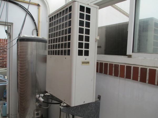 安裝在陽台晾衣間的熱泵,熱泵的除濕功能讓蔡家省了買烘衣機的錢和烘衣服的電費,為蔡家省大錢